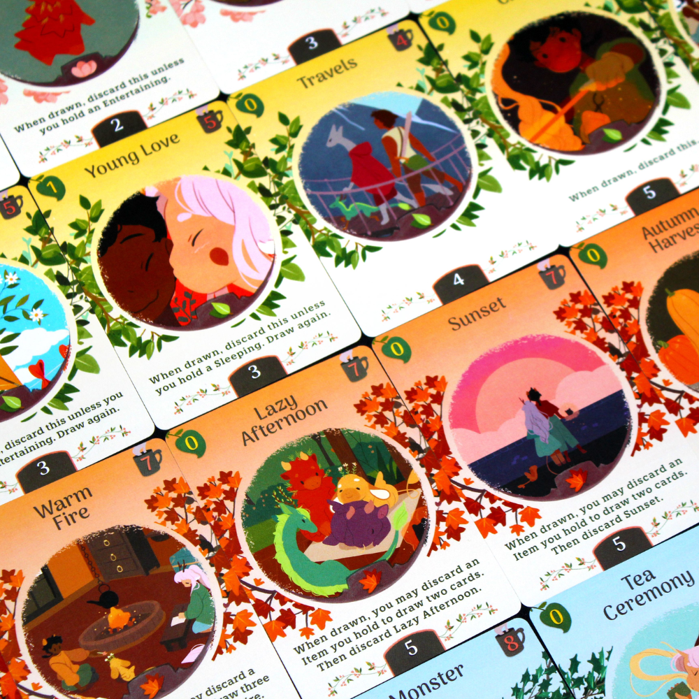 Each player's deck represents their own Tea Dragon. From turn to turn, players will choose to draw a card, triggering effects and strengthening their position, or buy a card, improving their deck or scoring points.