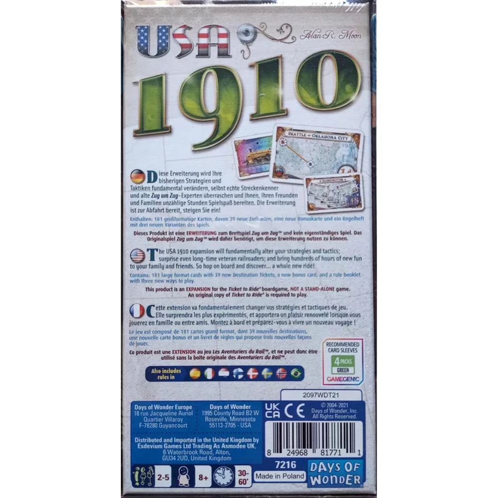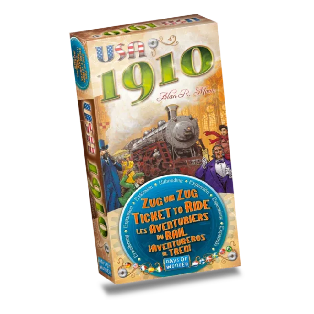 Ticket to Ride USA 1910 is a card expansion with 181 cards that add 35 new destination cards, a new bonus card and replacement cards for the original Ticket to Ride game. This expansion comes with three new set of rules that allow play in a thematic 1910 version, a 'Big Cities' only version and a mega version of this popular train game. A fun filled expansion that greatly increases the value of the original game, Ticket to Ride USA 1910 is a must have for fans of the original game.