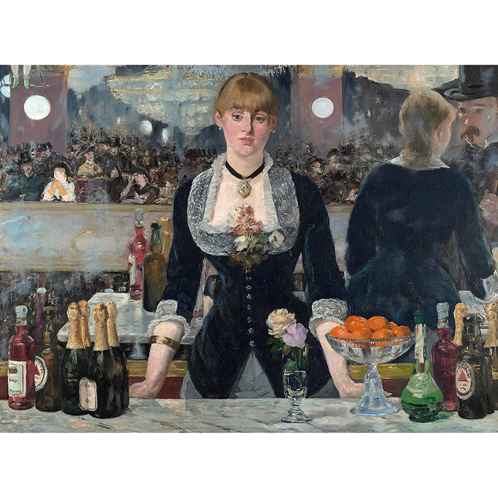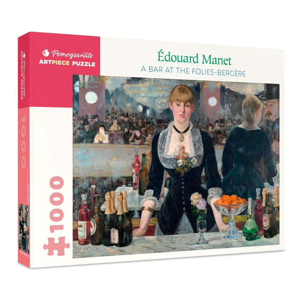 Édouard Manet (French, 1832–1883) A Bar at the Folies-Bergère, 1882 Join us at the Folies-Bergère! This popular Parisian cabaret, familiar territory for artist Édouard Manet, was a place to see and be seen (note the woman in the background, peering through opera glasses). A large mirror reflects the patron-filled interior and in turn reflects Manet’s impression of modern life in the French capital—this entertainment venue catered to the worldly bourgeoisie and was notorious for solicitation. The fashionably dressed, emotionally detached barmaid’s reflection is askew and its meaning ambiguous. Is she being propositioned or simply being asked for a glass of champagne? What story is the painter telling? Find your own interpretation of A Bar at the Folies-Bergère, Manet’s final masterpiece, as you puzzle over this 1000-piece jigsaw.