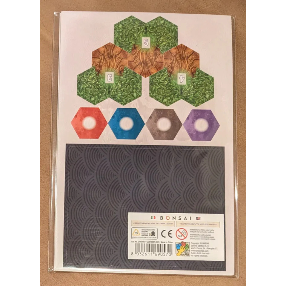 At the beginning of your turn, you may discard as many cards as indicated on one of the triple tiles still available in order to obtain that tile. Turn the tile over and place it in your bonsai immediately, making sure that at least one of the four wooden sides of the tile touches a bonsai wood tile, then take the rest of your turn as usual.