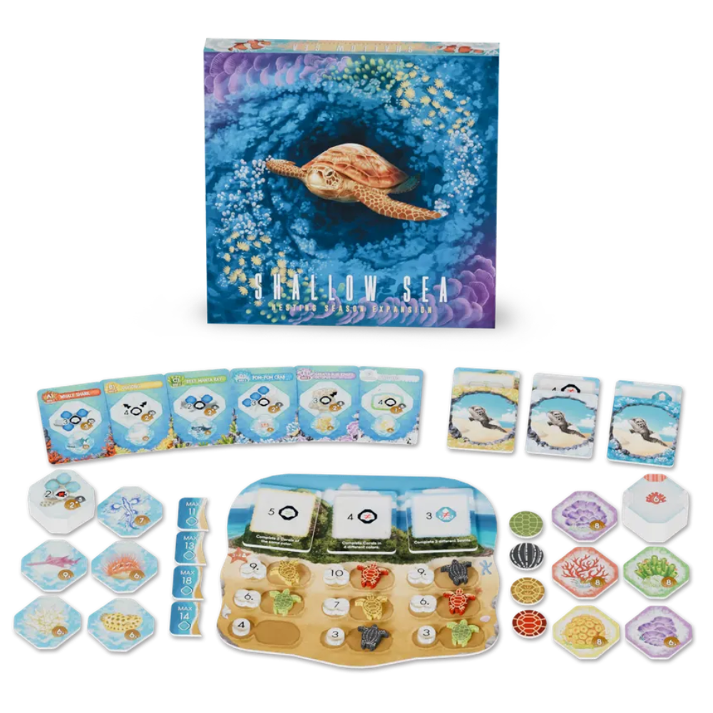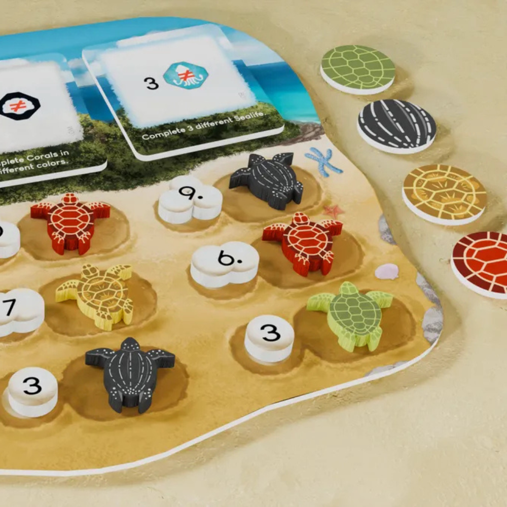 The Nesting Season Expansion introduces exciting competitive interaction between players. By creating a thriving underwater ecosystem, players can empower turtles to brave the shores and lay their precious eggs. Guide your sea turtles to the ideal nesting grounds! With an extensive selection of brand-new Sealife, Ecosystem Cards, and Corals, enrich your gameplay experience!