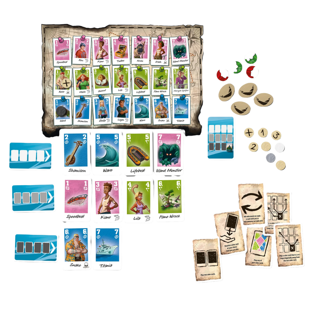 A gameboard, island marker, various tokens, and special cards help players keep track of the game and offer opportunities to influence the course of the missions.
