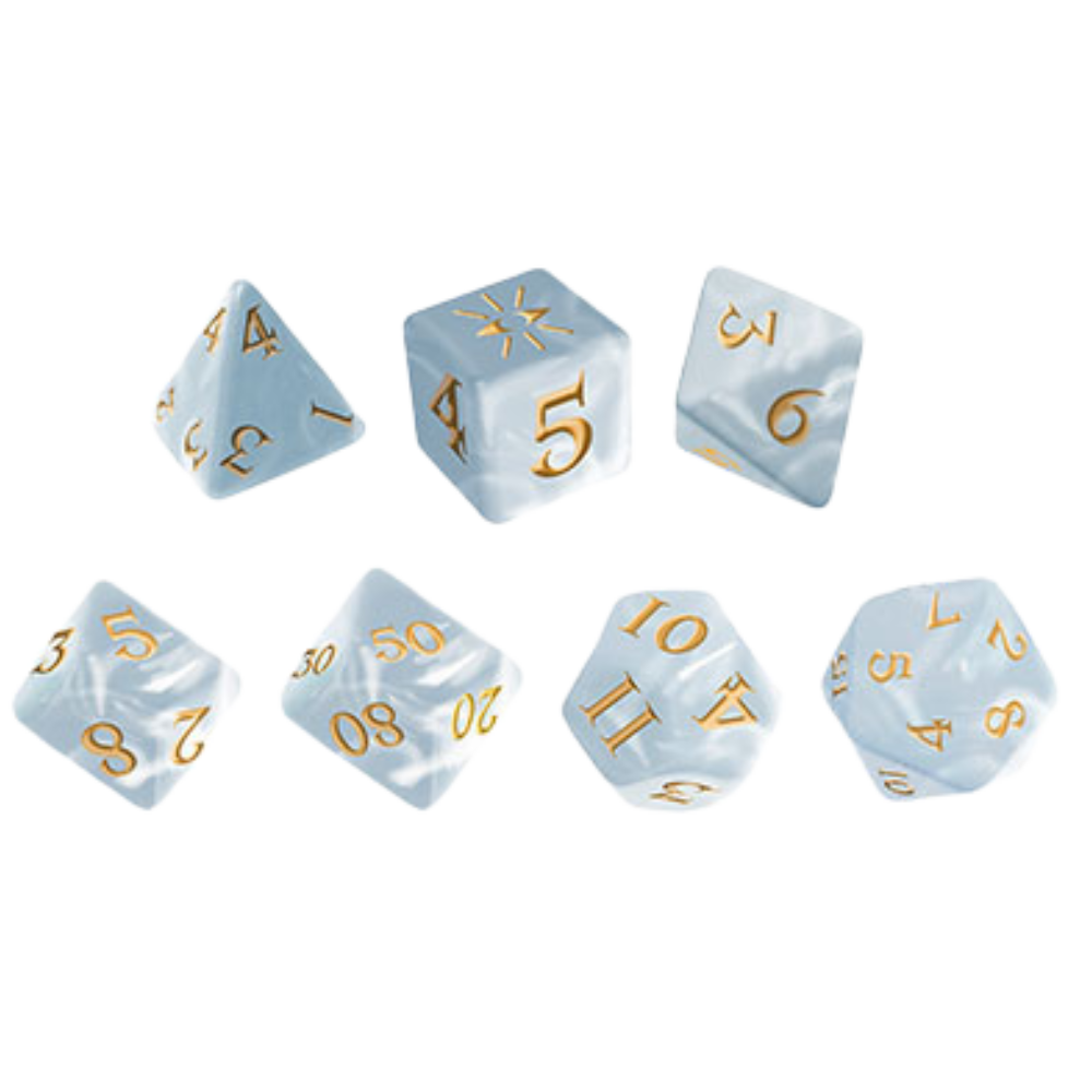 Bless your dice, or fall prey to the enemy's apocalyptic power. Uniquely styled Sisterhood dice let the table know where your allegiances lie. Angel Dice bring a grandiose style to the table, with their evocative gold and cloudy finish.