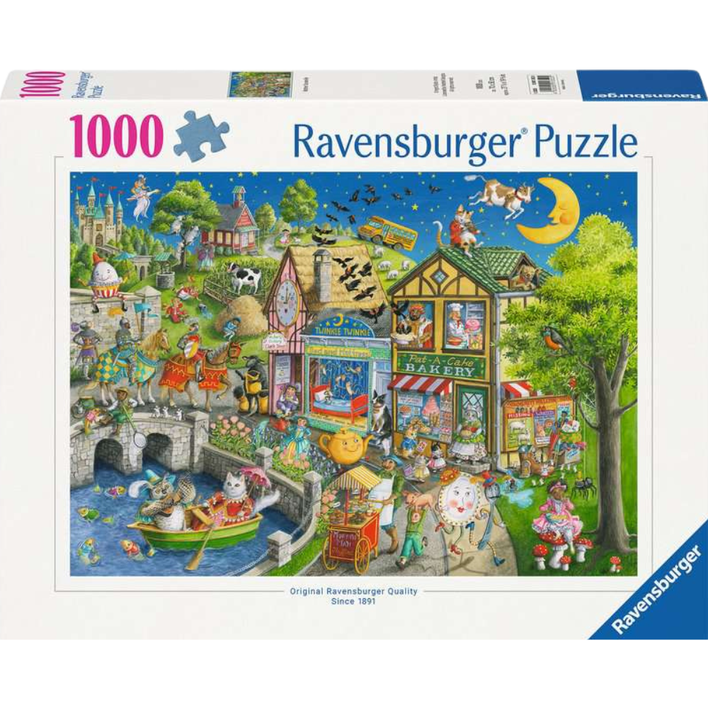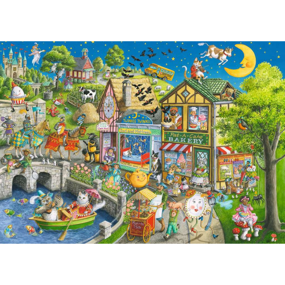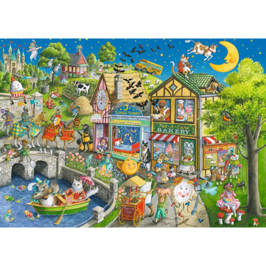 The scene is bustling with delightful characters, each drawn from the timeless tales we all know and love. In the centre, knights in shining armour ride proudly on their horses, guarding this magical town. Nearby, the Cat and the Owl sail serenely in their tiny boat, embarking on an adventure under the stars. High above, the Cow jumps over the Moon, adding a playful touch of magic to the night sky.