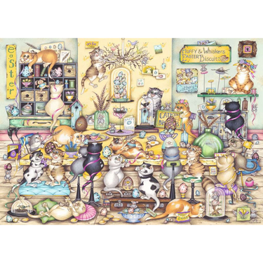 Step into a delightfully chaotic world of feline fun! Join the mischievous moggies as they dive whisker-first into Easter festivities, surrounded by colourful eggs, playful patterns, and delightful springtime details. Every corner of this puzzle bursts with personality, humour, and intricate artwork that will keep you smiling as you piece it together.