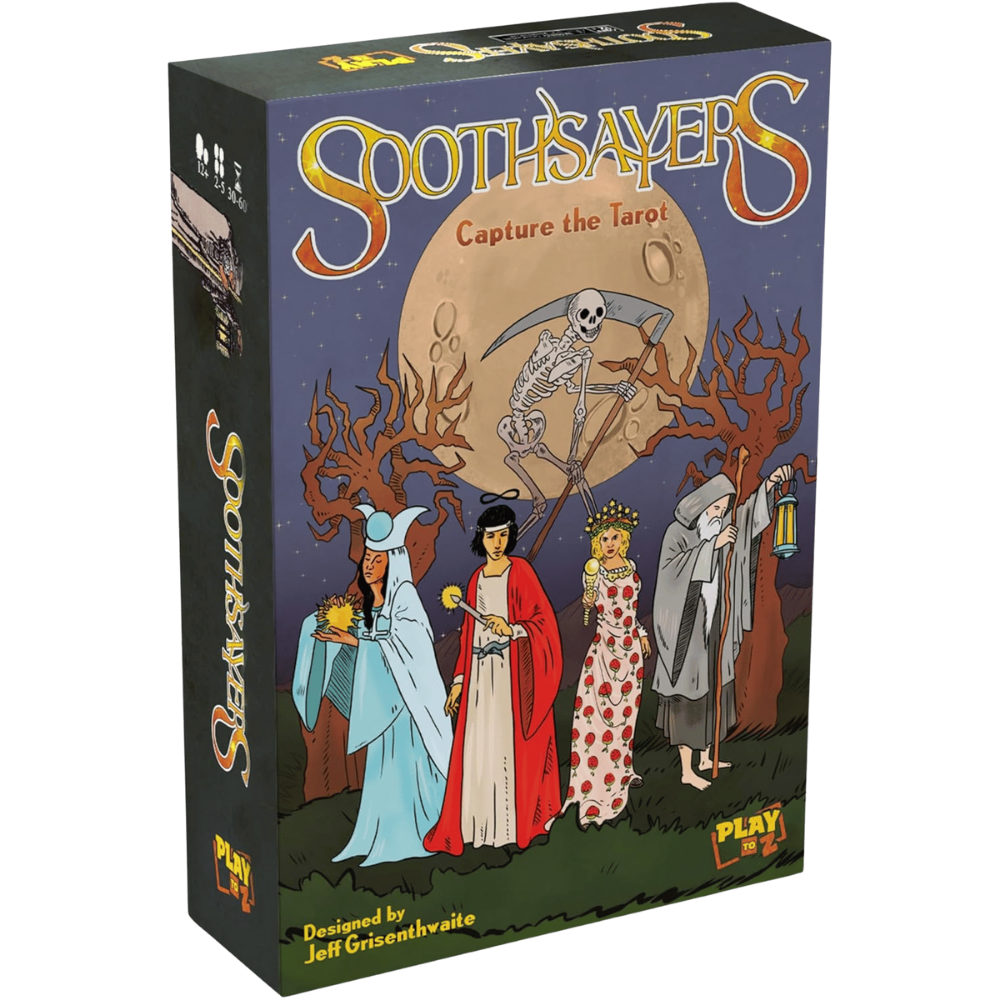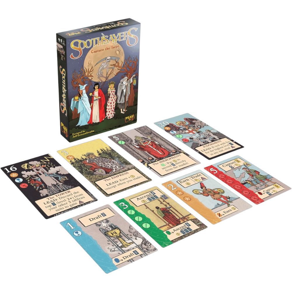 On your turn, choose an action: earn coins, draft cards, ascend to higher levels, or capture a tarot card. Rival soothsayers may choose to follow your action, but if you have a higher level, they must pay you for the privilege.
