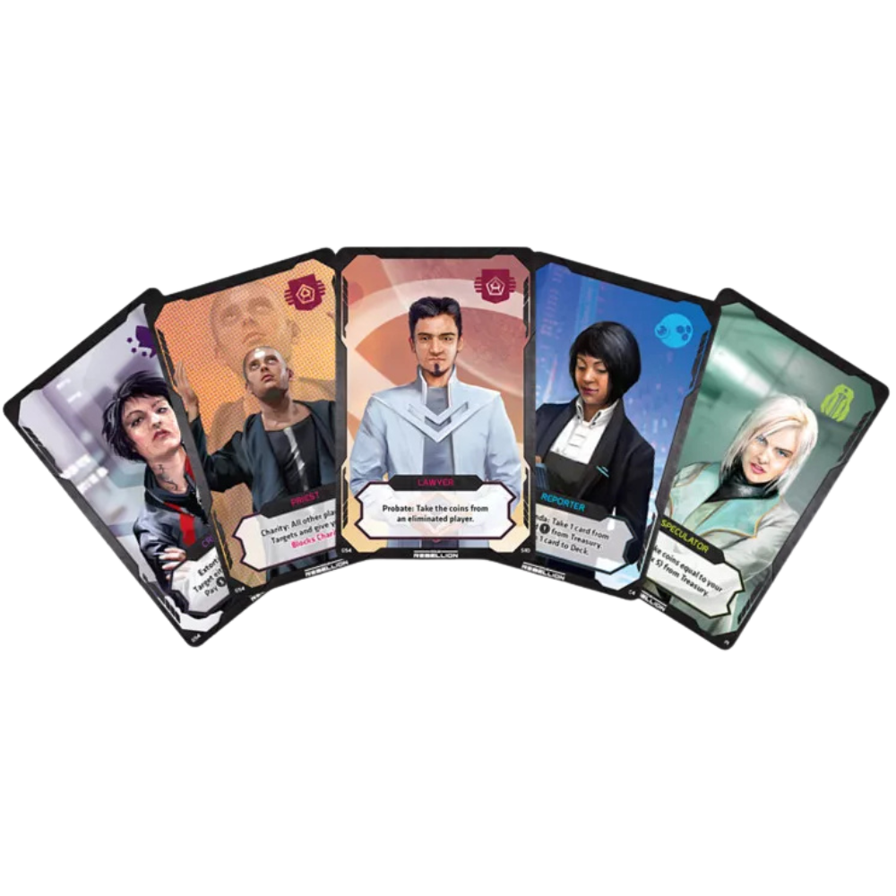 In Coup: Rebellion G54 (G54), the last player with influence in the game wins, with influence being represented by face-down character cards in your playing area. Before each game players choose five character roles from a randomized deck. Characters have a unique variable power, and the deck is formed by three iterations of each role for fifteen cards total.