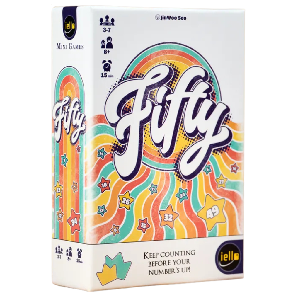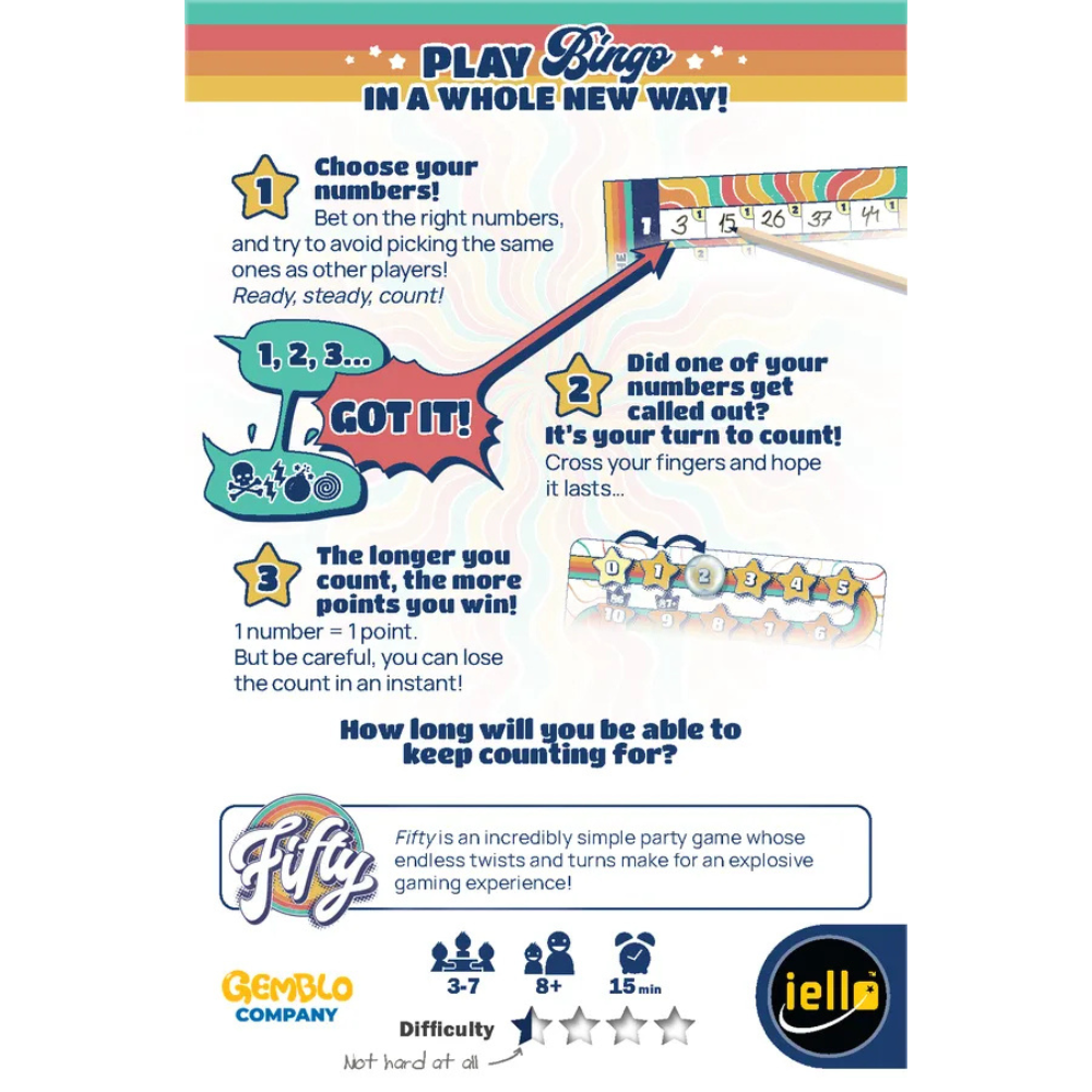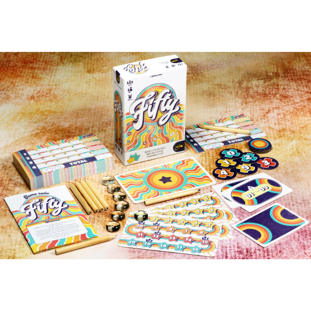In Fifty, you choose your numbers between 1 and 50 and write them on your sheet. Try to avoid picking the same ones as other players. Now, start to count! 1,2, 3… Did one of your numbers get called out? It’s your turn to count and the longer you count, the more points you win! But watch out: if you call out a number that another player chose, they take over the count! How long will you be able to keep counting for?