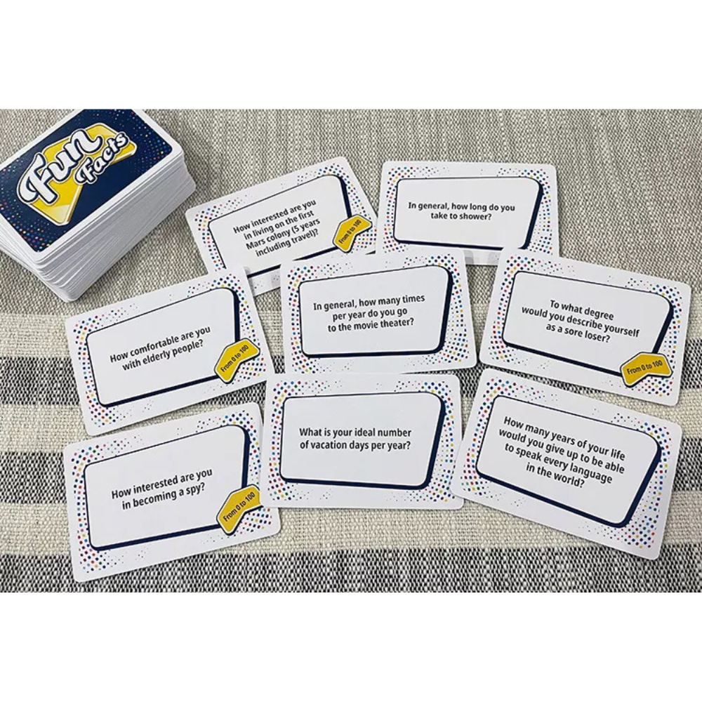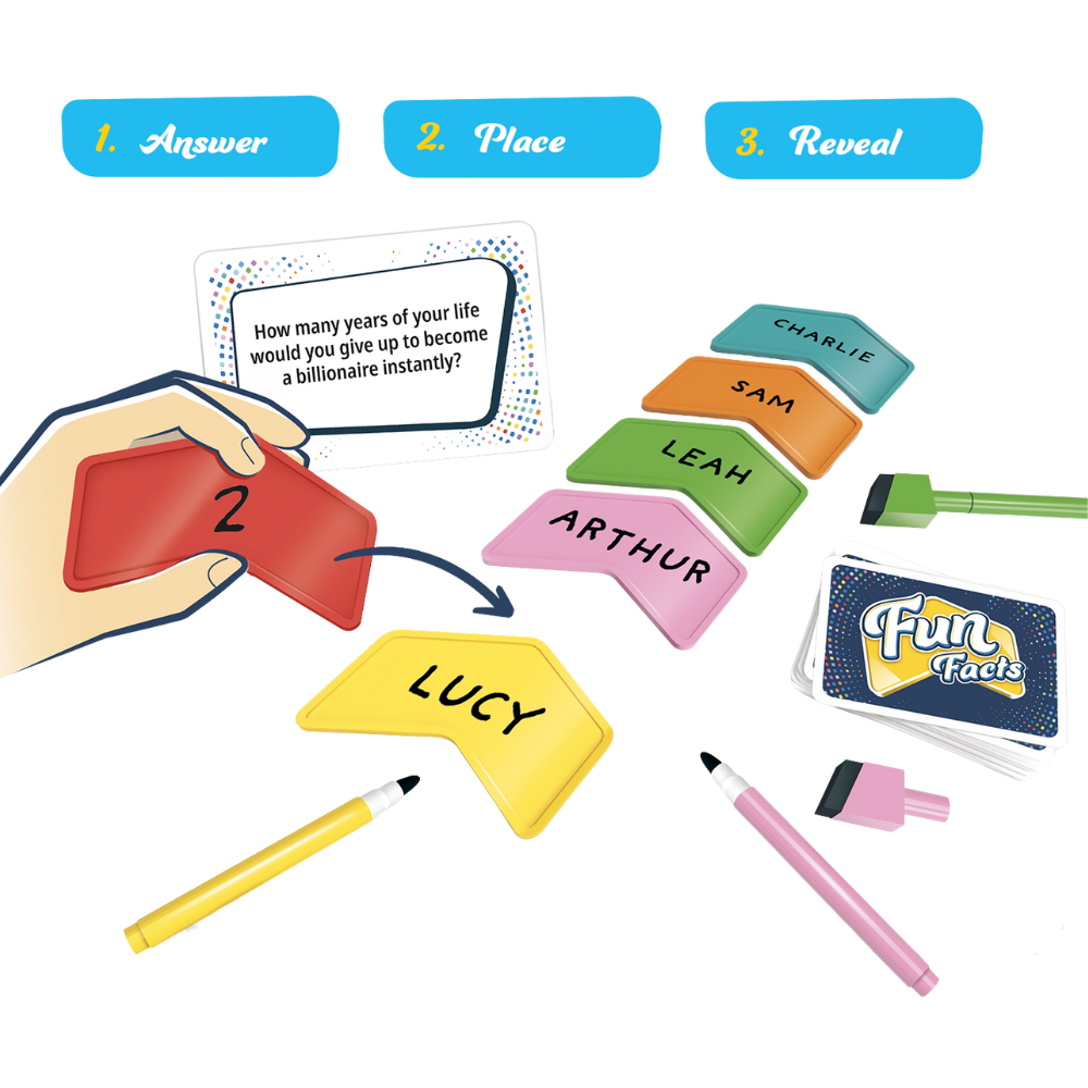 Each round in Fun Facts, a question is placed in the center of the table, e.g., "How long is the perfect nap?", then everyone secretly writes their answer on their colored arrow and places that arrow face down on the table. (You write your name on the other side of the arrow so that everyone knows which arrow is whose.)