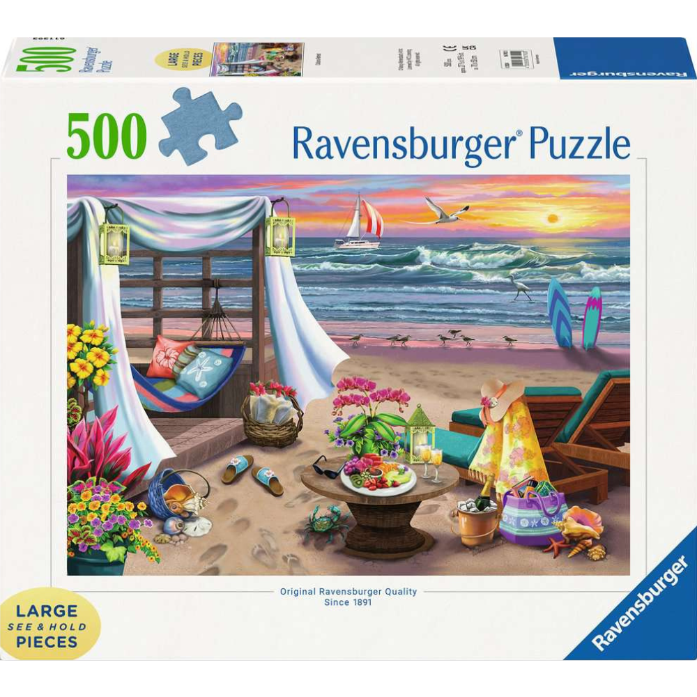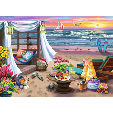 Take a dip, catch some waves, or simply lounge around — this "Cabana Retreat" is all about you! Escape to a tropical paradise with Cabana Retreat, a stunning 500-piece large format jigsaw puzzle. This beautifully detailed scene invites you to a cosy beachfront hideaway, where a hammock sways gently in the ocean breeze, vibrant flowers bloom, and surfboards lean against a rustic cabana, ready for the next adventure. With extra-large, easy-to-handle pieces, this puzzle is perfect for a relaxing and enjoyable experience. Whether you're a seasoned puzzler or just starting out, lose yourself in the tranquil beauty of this sun-kissed seaside retreat.