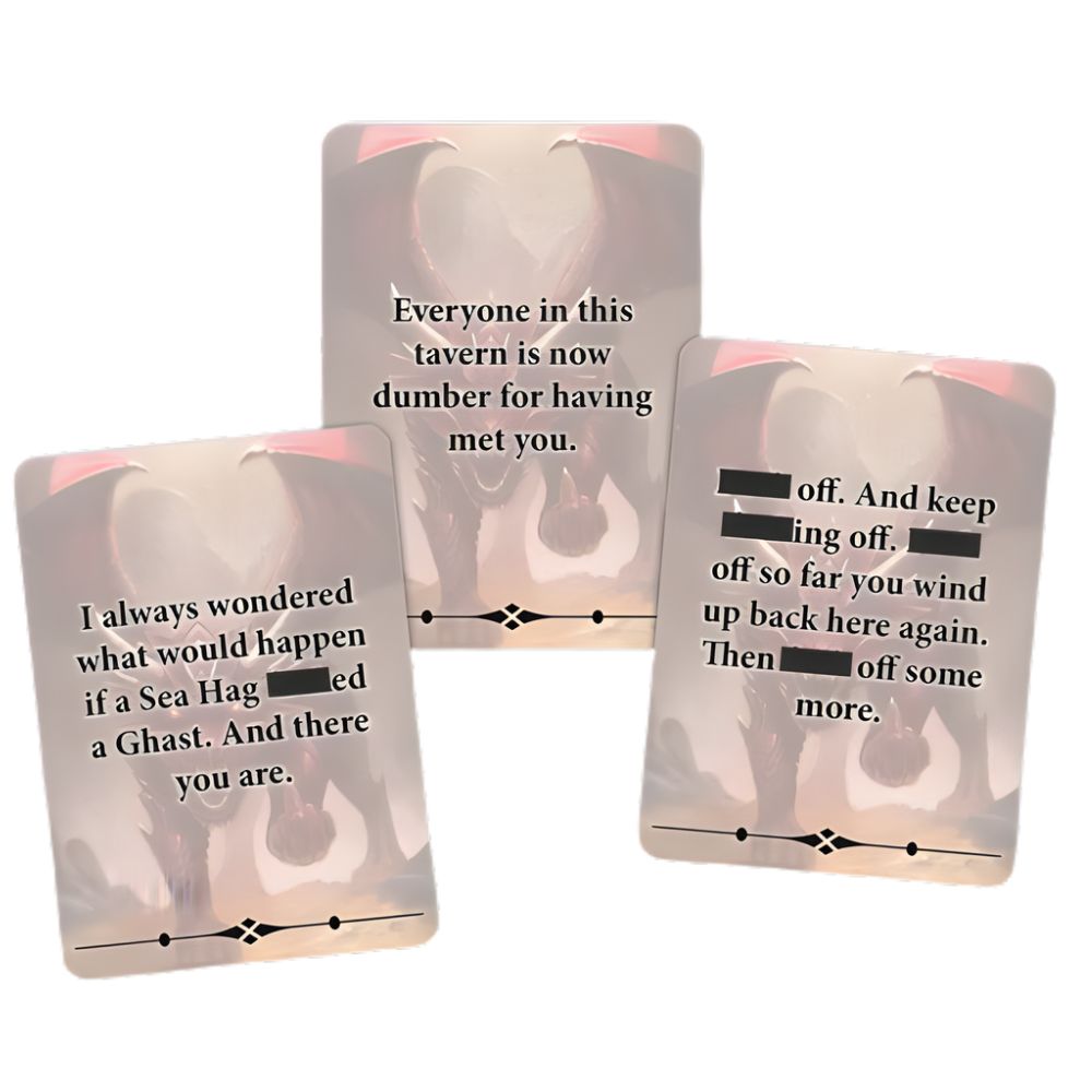 The Deck of Many Insults delivers one hundred premium banter cards filled with clever burns, monster themed jabs, and laugh inducing put downs. Crafted by the award winning creators at Loke, this deck adds flair to bard performances and livens up any tabletop RPG with unforgettable quips. Whether you are roasting friends or humiliating foes in character, these cards guarantee fast and flavorful verbal combat. A perfect accessory for groups who appreciate bold humor and lively table energy.