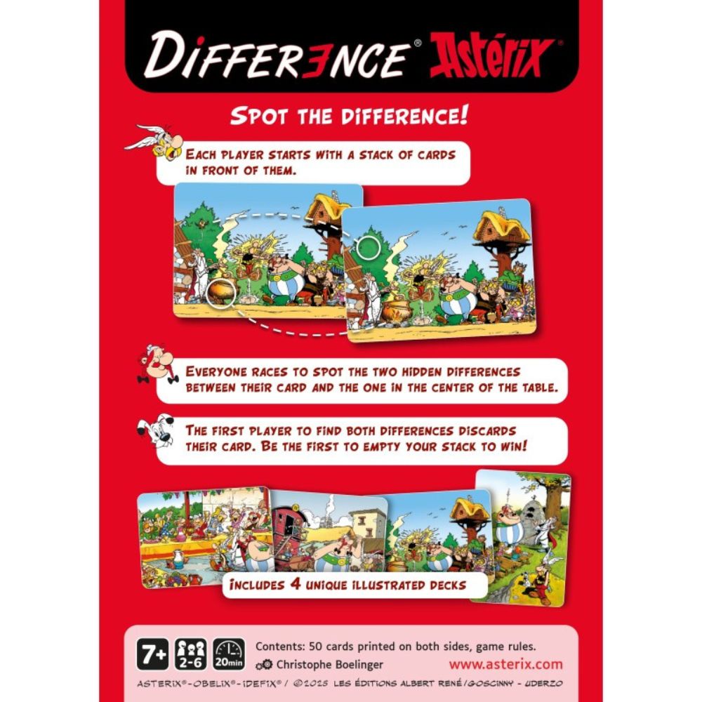 In Difference – Asterix Edition, each player has a stack of cards showing (almost) the same scene. But two details are different. Each turn, be the fastest to spot the differences between your card and the one in the centre of the table. The faster you are, the quicker you get rid of your cards—and the closer you get to victory!