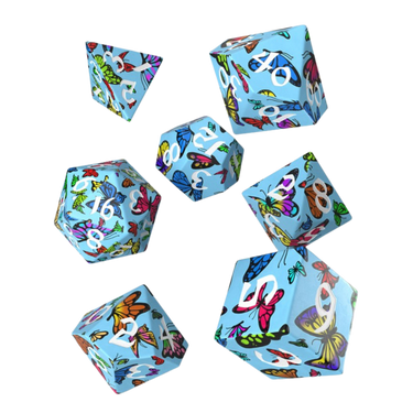 The Full Art Dice Set: Butterfly captures the beauty of motion and colour. Vivid butterflies glide seamlessly across 7 polyhedral dice, creating a living tapestry of sky and wings. Clear runic digits make every throw easy to read — and hard to forget. These dice let you be a connoisseur of your own making.