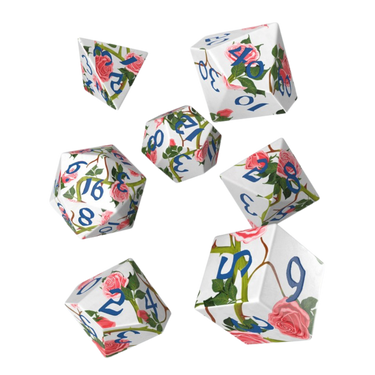 Full Art Dice Set: Roses captures the fragile beauty of blooming flowers. Soft pink and green hues flow over white dice, forming a continuous pattern. Each roll feels like a small act of cultural artistry. Clear runic digits make every throw easy to read — and hard to forget. These dice let you be a connoisseur of your own making.