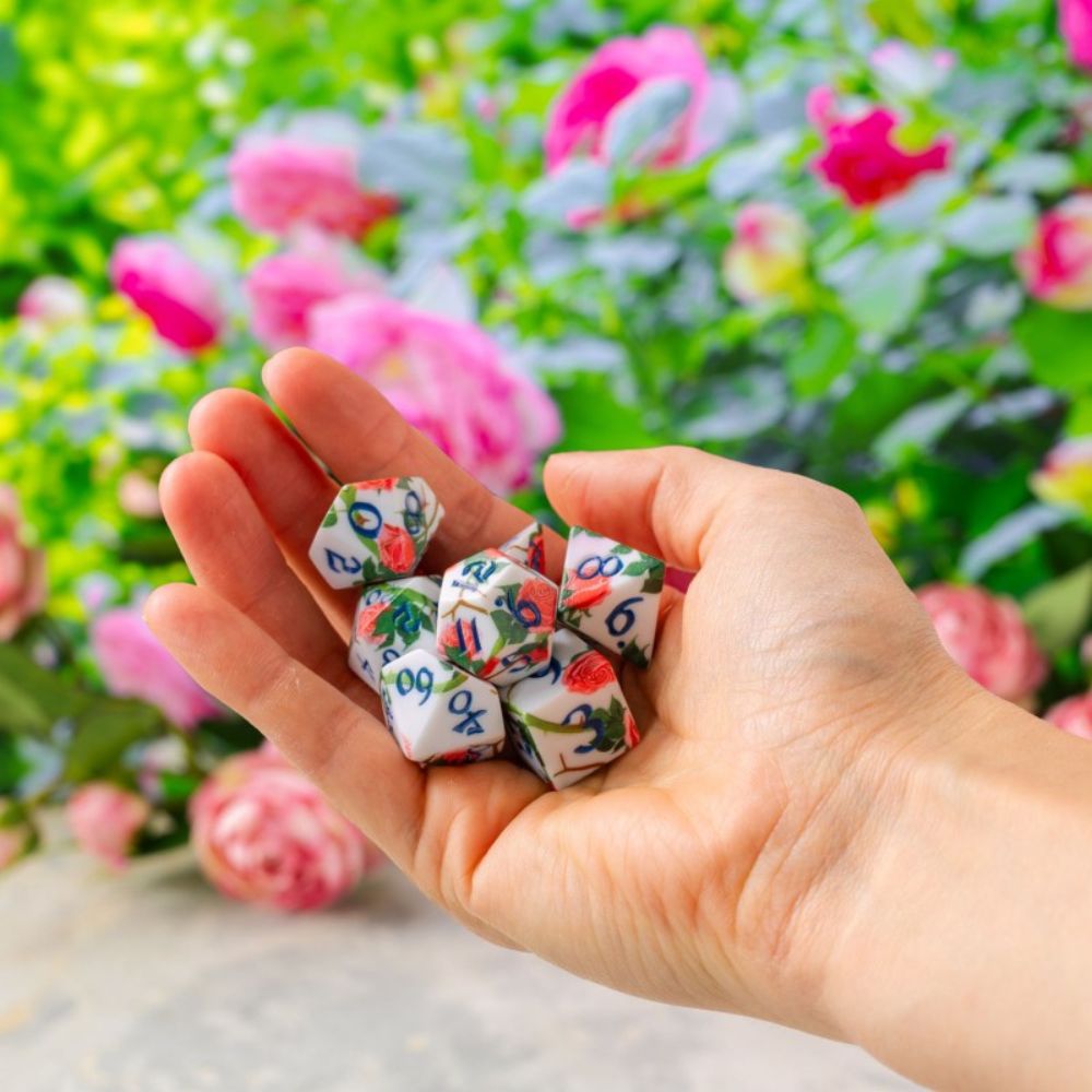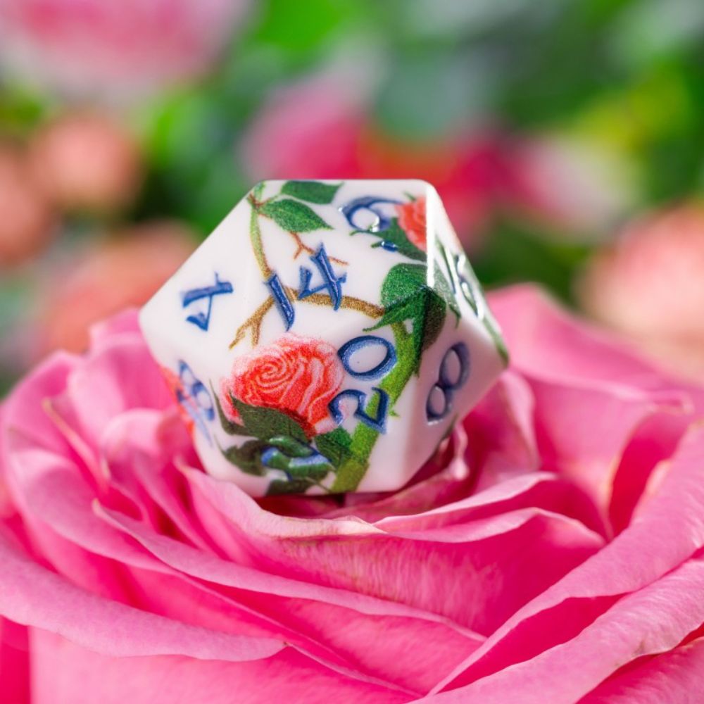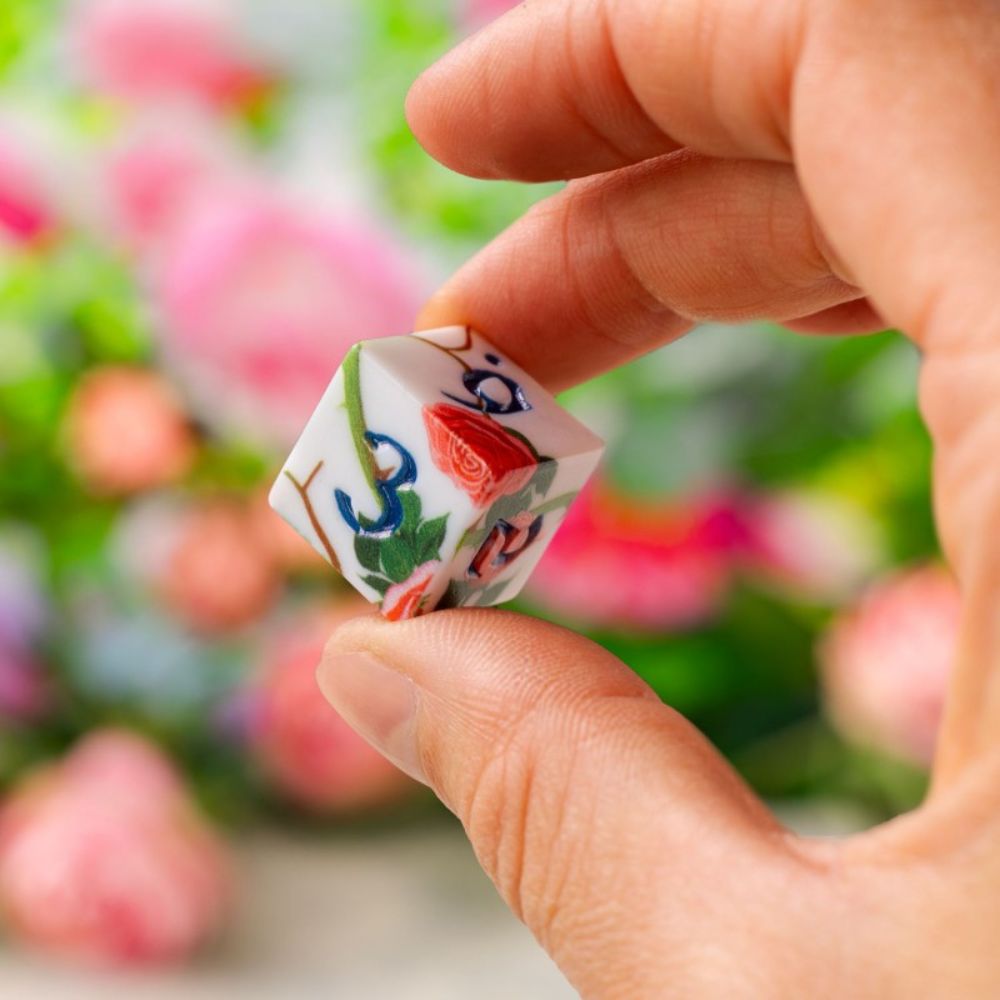 Imagine a rose garden after rain. Dew glimmers on petals, the air hums softly with calm. Each dice holds that moment — fragile yet eternal, fleeting yet serene. These are not tools, but emotions carved in colour. Roses that will never fade, ever.