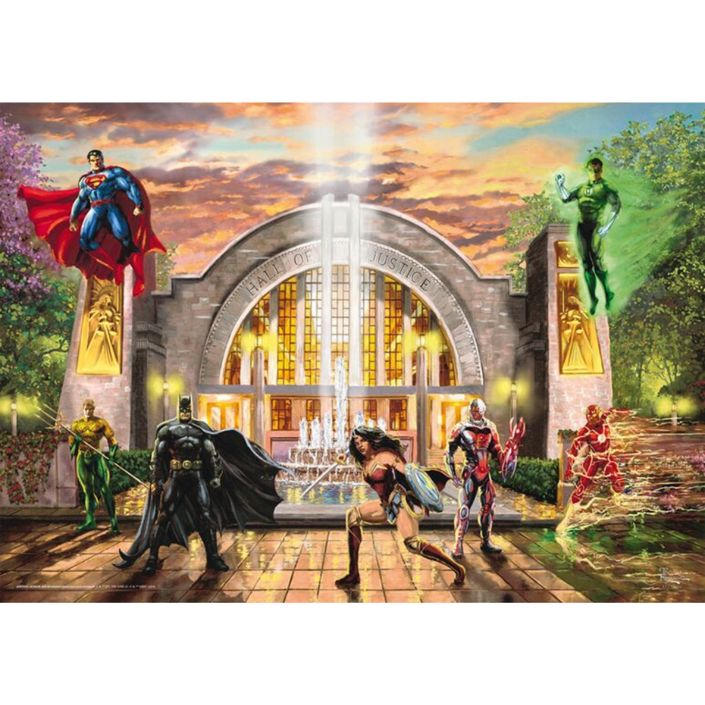 Assemble the world’s greatest heroes in this dynamic 1000-piece puzzle from Schmidt, featuring the iconic Hall of Justice in stunning detail by Thomas Kinkade Studios. Superman, Batman, Wonder Woman, Aquaman, The Flash, Cyborg, and Green Lantern gather for action in a scene brimming with colour, energy, and heroic presence.