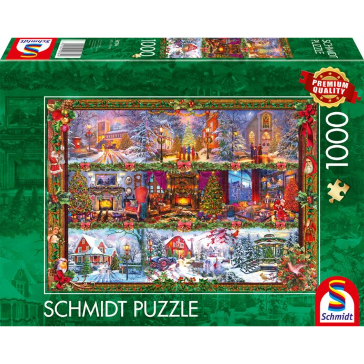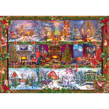 Celebrate the magic of the holiday season with the Merry Christmas Time Puzzle. This beautifully detailed 1000-piece puzzle captures the warmth and joy of Christmas through a series of festive vignettes. From snowy village scenes and carol singer to cosy, decorated living rooms complete with twinkling Christmas trees and roaring fireplaces, every part of this puzzle evokes holiday cheer.