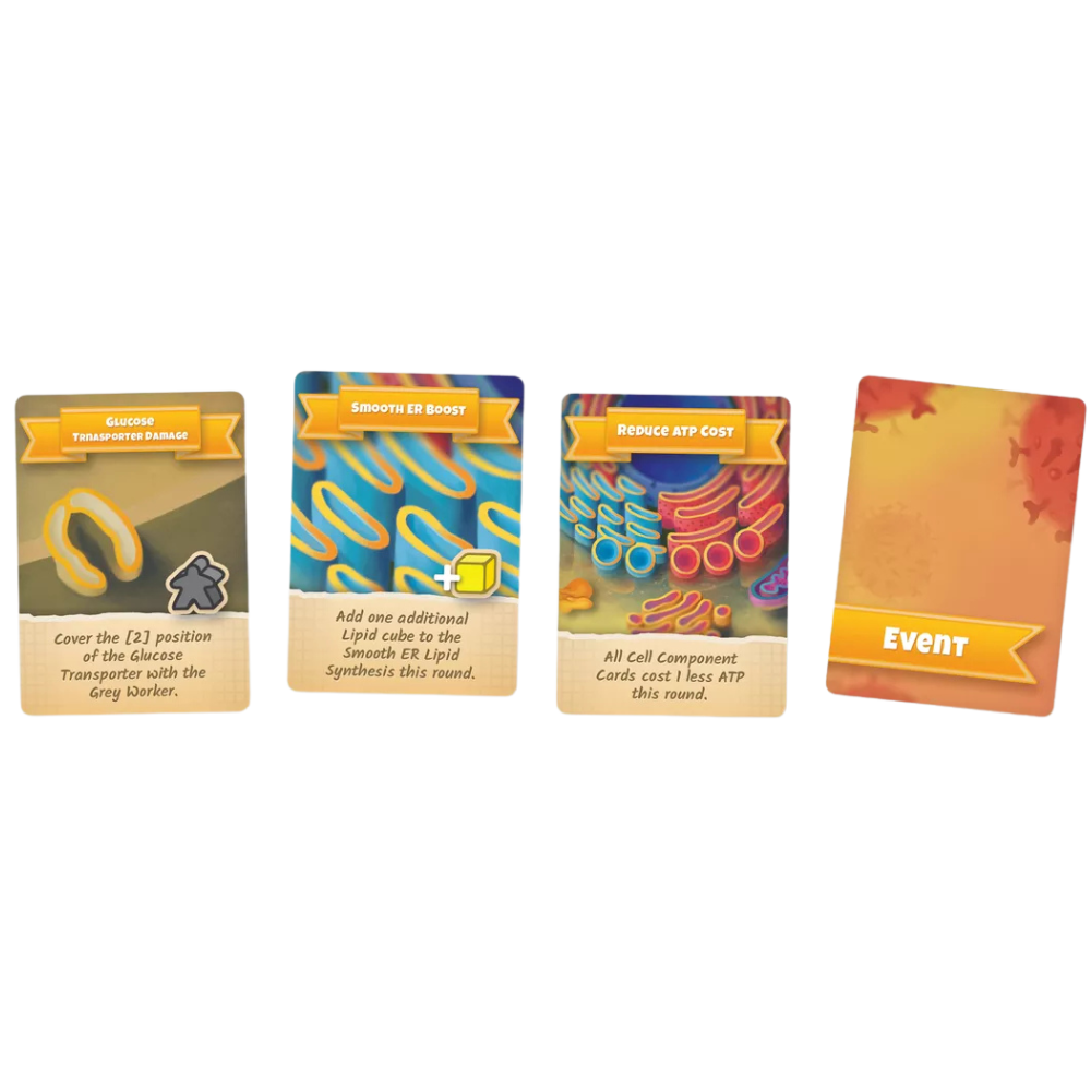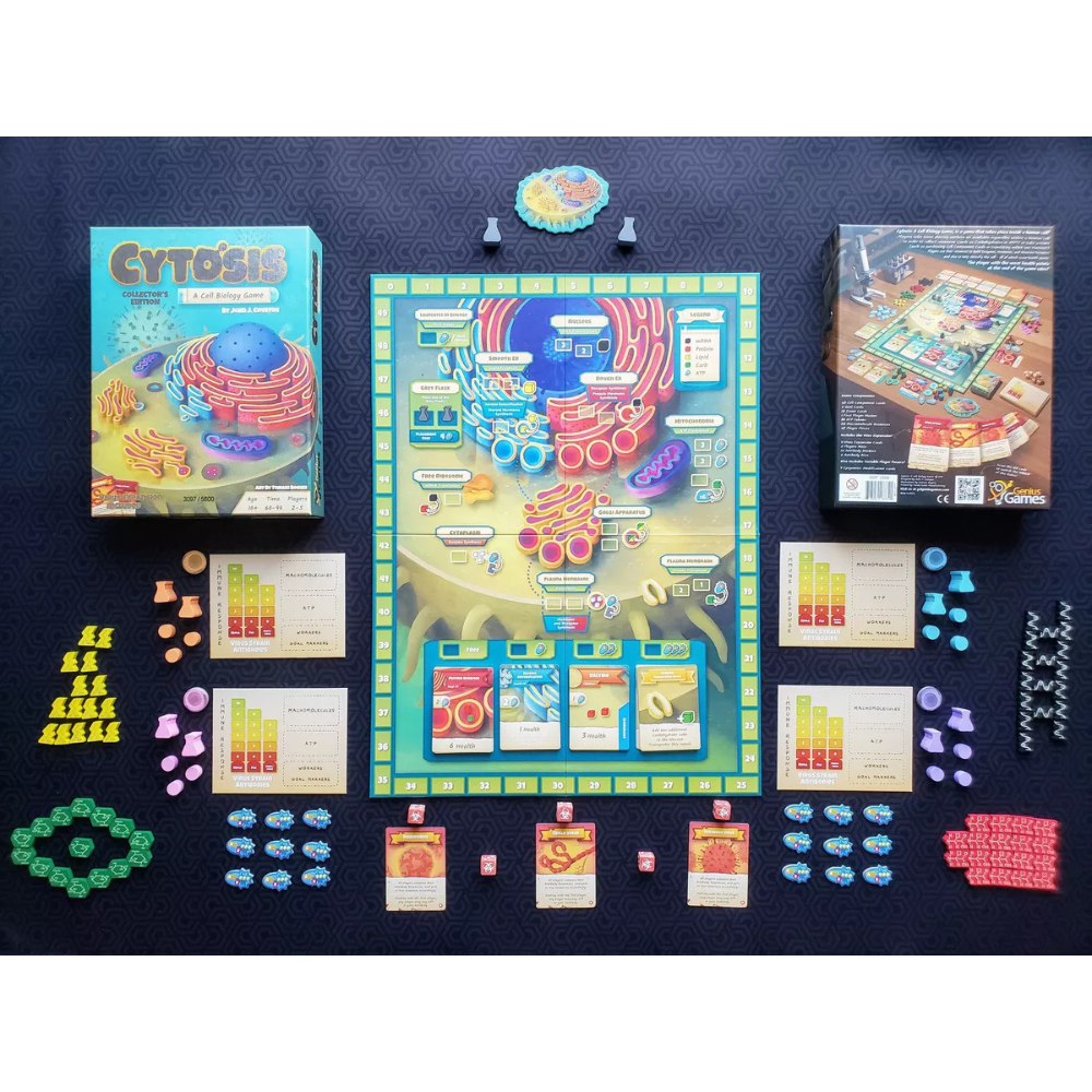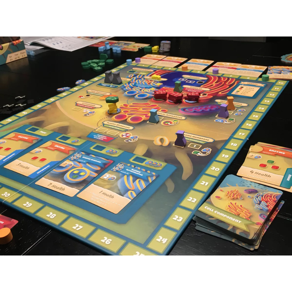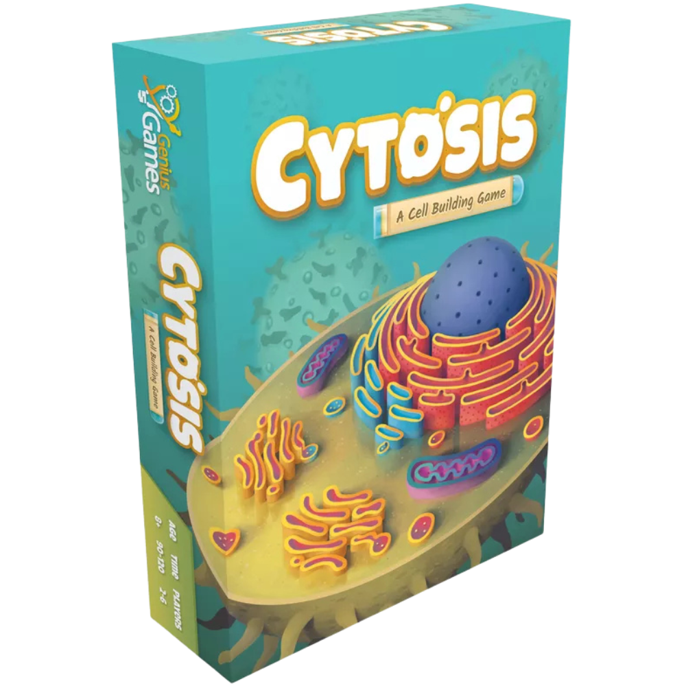 Cytosis: A Cell Building Game is a worker placement game that takes place inside a human cell. Players start out with a number of workers and on a player’s turn, they will place one of their workers in any available location within that cell. Some of the locations provide players with resources (e.g., mRNA, ATP); some with actions (e.g., convert resources, collect cards). Resources are used to build enzymes, hormones and/or receptors, which score Health Points. The player with the most Health Points at the end of the game wins!