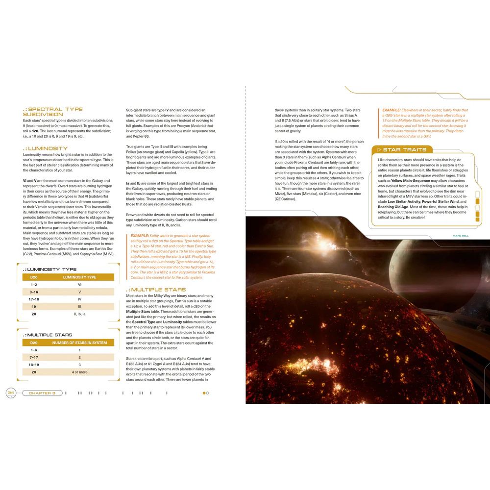 - Advice and random tables to populate those new star systems with a variety of inner and outer worlds, moons, and ringed worlds for your crew to study, visit, and explore.