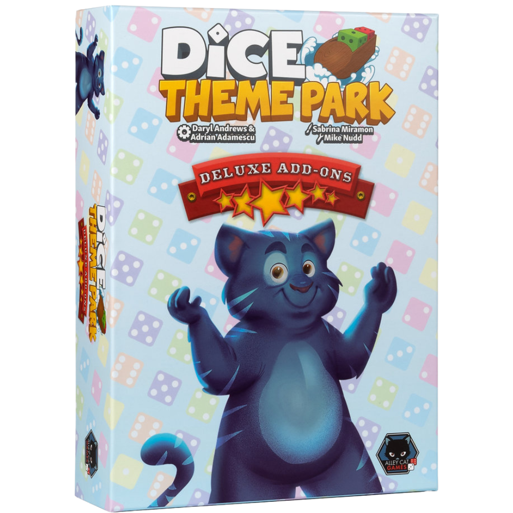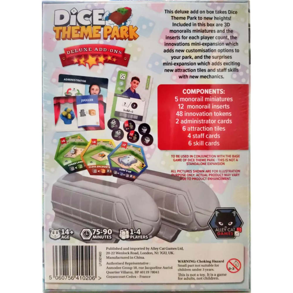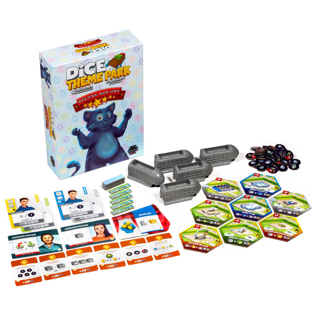 This add-ons box is the best way to turn your game Deluxe! This box can be added to the base game of Dice Theme Park to upgrade your components and add extra expansion content.