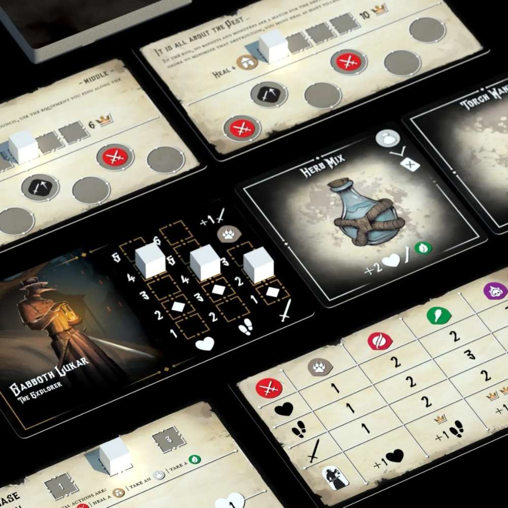 Welcome to Light in the Dark, the solo dungeon crawler board game where you take on the role of a courageous plague doctor, on a quest to heal a region afflicted by the deadly plague. The journey ahead won’t be easy, as you’ll face fierce monsters and dangerous bandits who are determined to stop you.