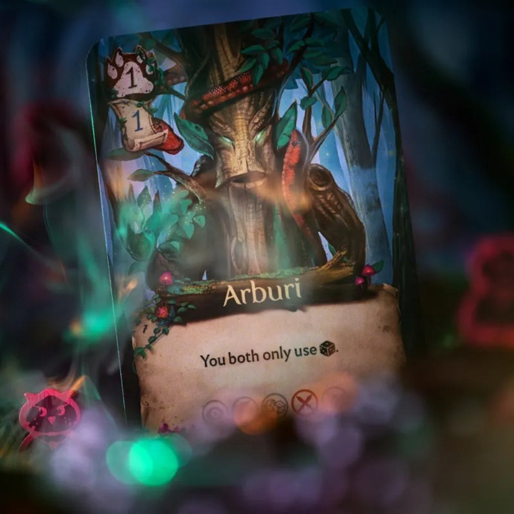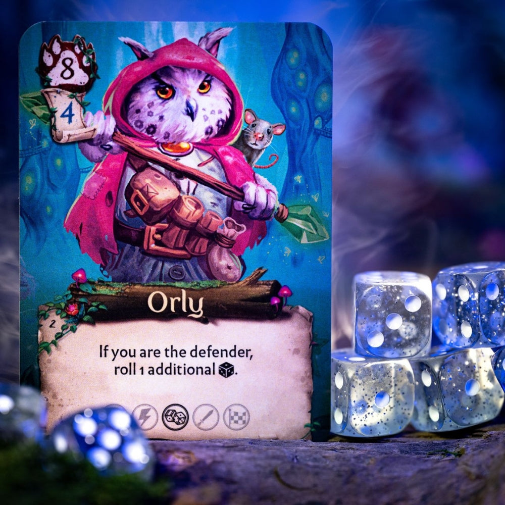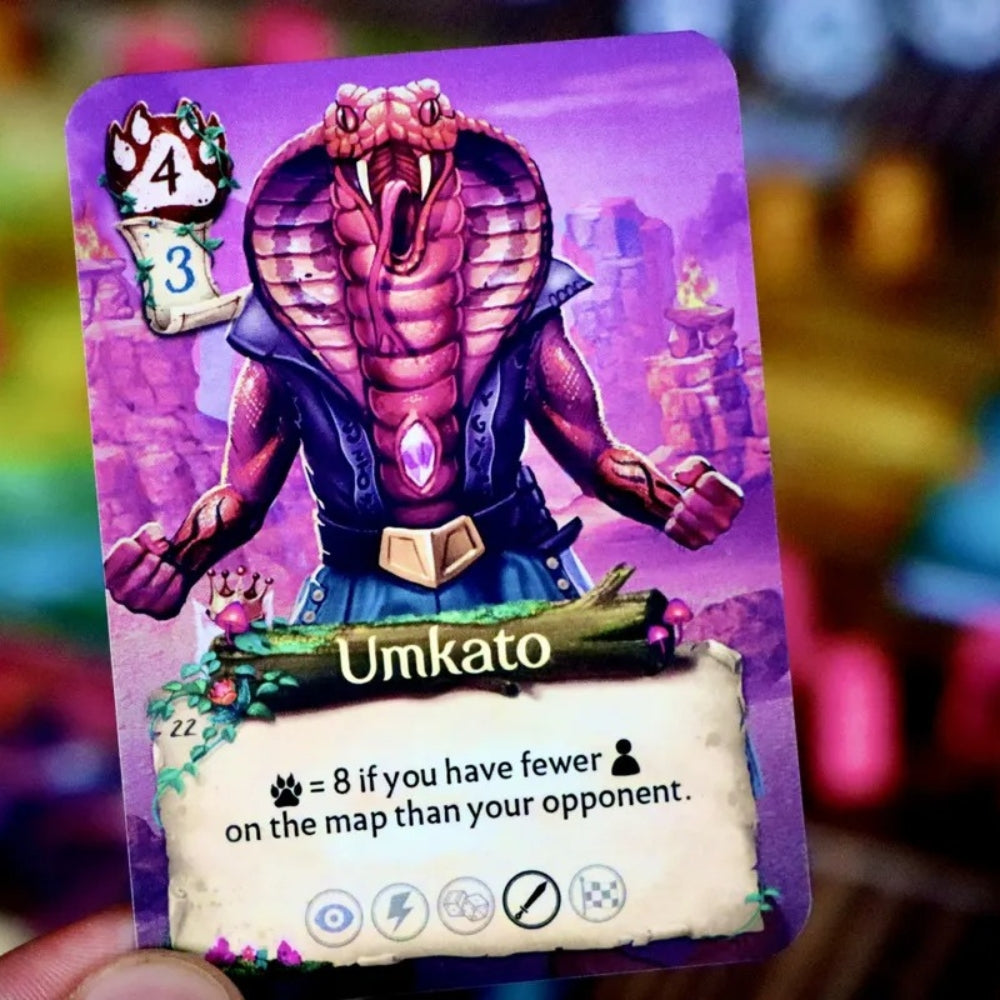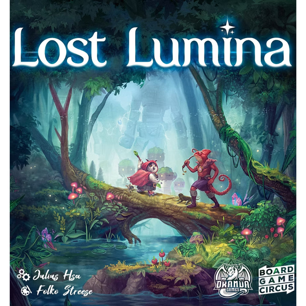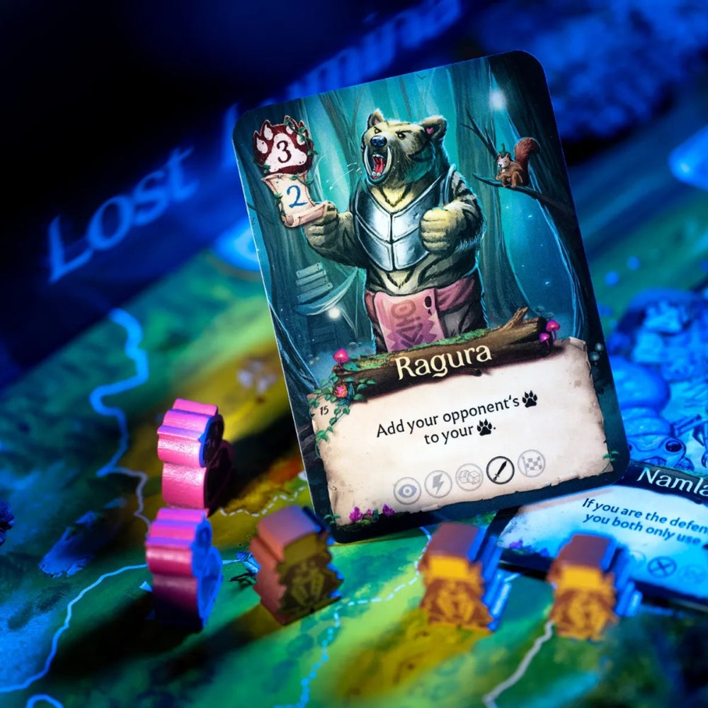 In Lost Lumina, two players battle with their party of diverse animalistic characters for control over the regions of Amanaar. In the beginning each player drafts 10 out of 27 beautifully and individually illustrated cards. On your turn you play a card from your hand and take a number of actions equal to the action point value on the card.