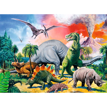 Piece together a prehistoric adventure with this exciting 100-piece jigsaw puzzle! Featuring a stunning scene of various dinosaurs in their natural environment, complete with a dramatic volcano erupting in the background, this puzzle offers a thrilling challenge.