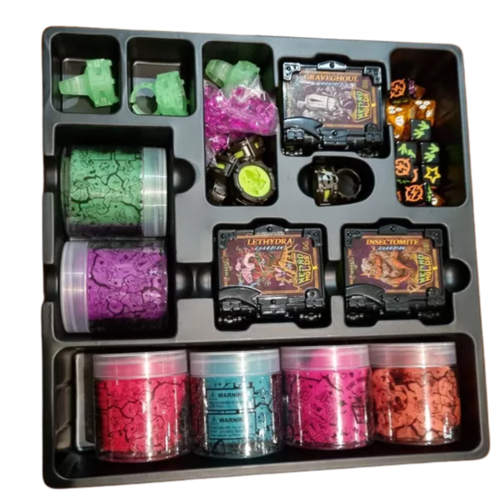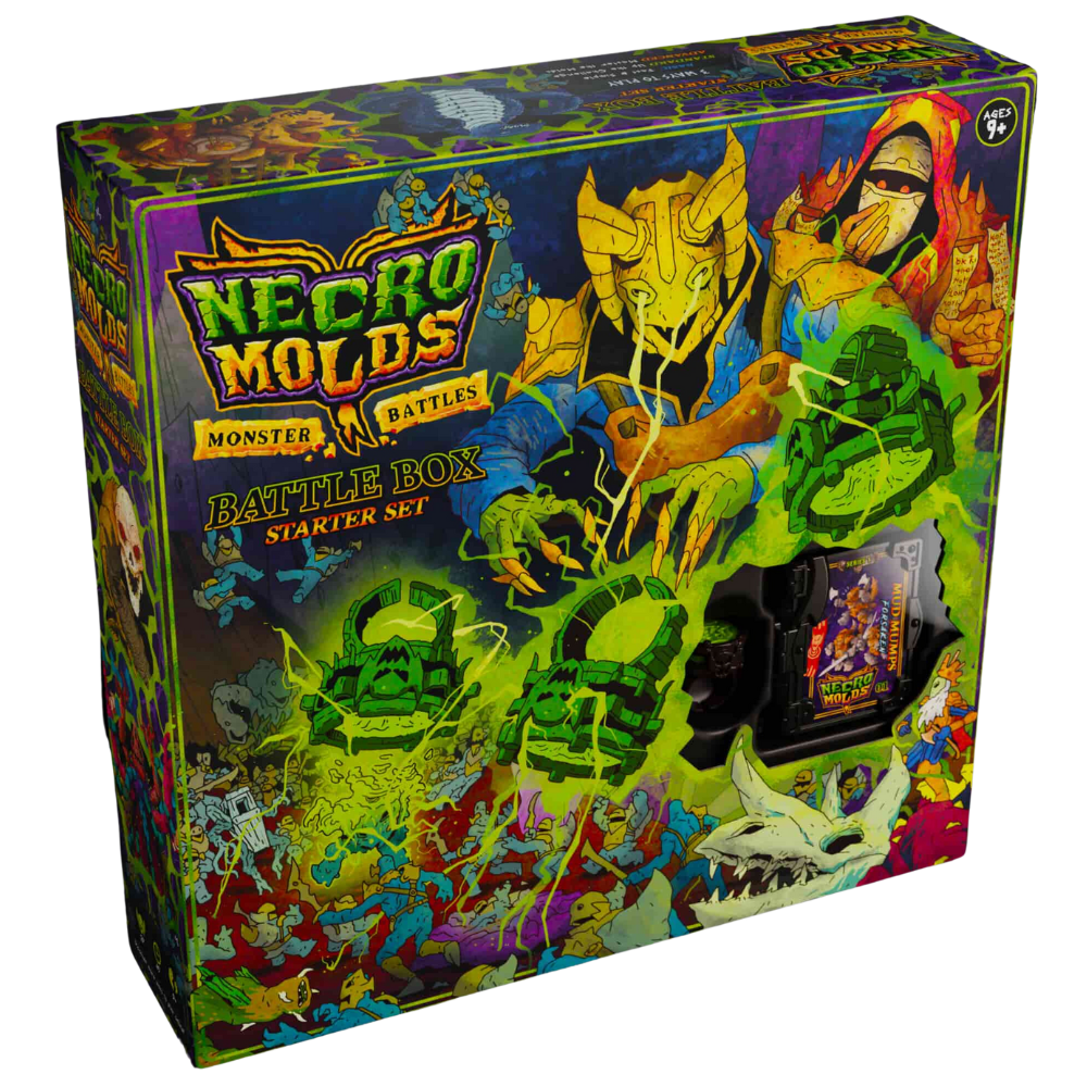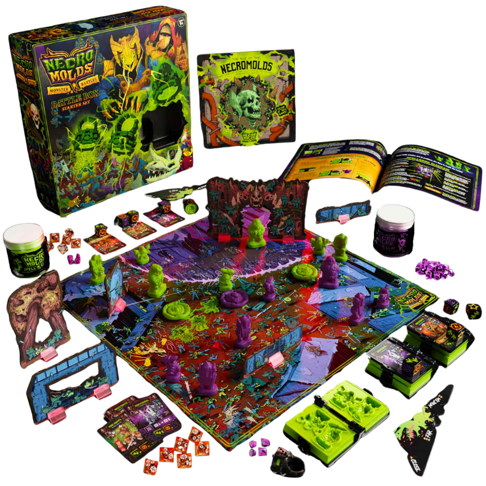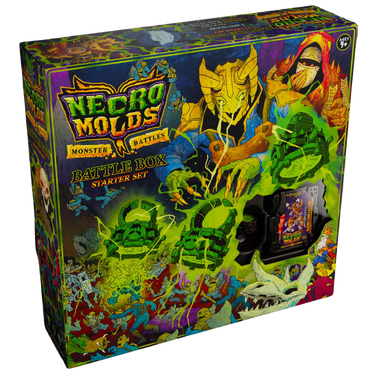 In Necromolds: Monster Battles, players build and battle golem armies using their Necromold spellbooks and containers of spell clay. The stronger the monster, the more clay it demands - so build your army wisely! Roll and assign your command dice each round to determine when monsters move and fight. Roll your combat dice to resolve monster battles, leaving the defeated monster smashed on the battle map!