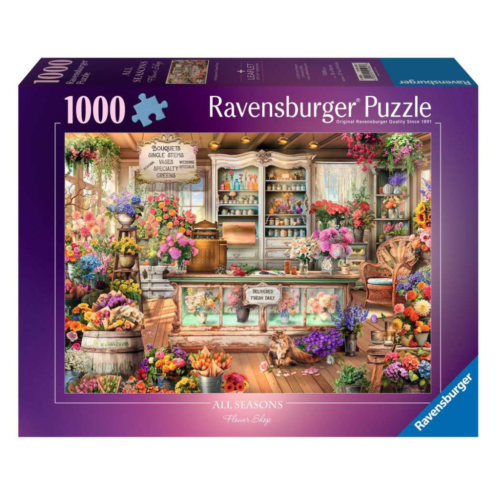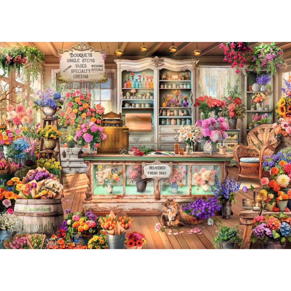 Every piece of this 1000 piece jigsaw puzzle brings to life the intricate details of the flower shop: from the charming pots and vases holding an array of flowers to the cozy interior, inviting patrons to revel in the beauty of nature's gifts. The puzzle celebrates the continuity of seasons, encapsulating the changing tapestry of flowers and colors throughout the year.