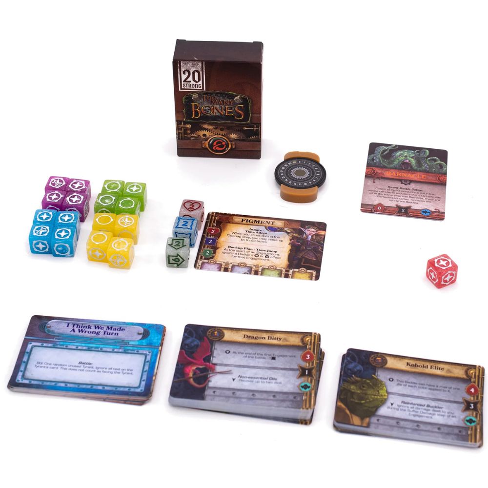 The Too Many Bones deck for 20 Strong features 5 of your favourite Gearlocs, 4 of the most detestable Tyrants, 43 Baddies brought to life in beautiful colour, and 16 Encounters. And Nugget is ready to venture beyond Daelore, so you can take her to space with the Solar Sentinels or hope for success on other 20 Strong adventures!