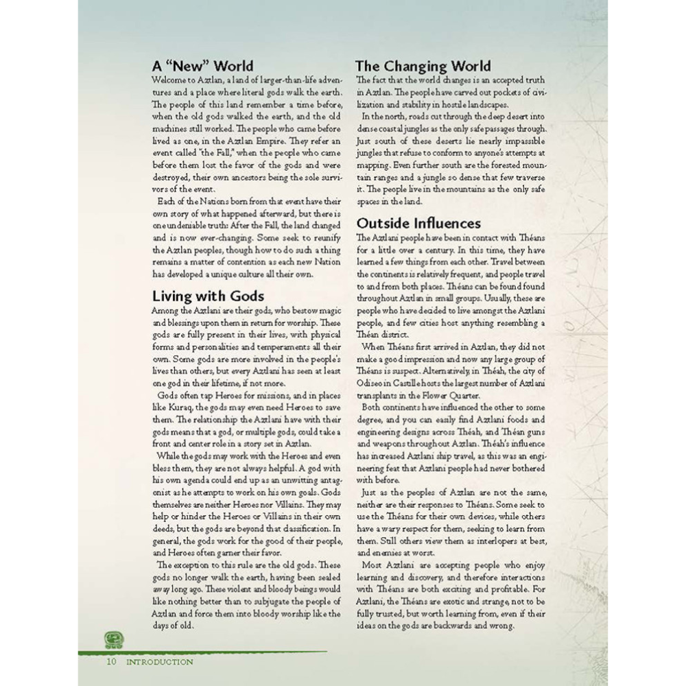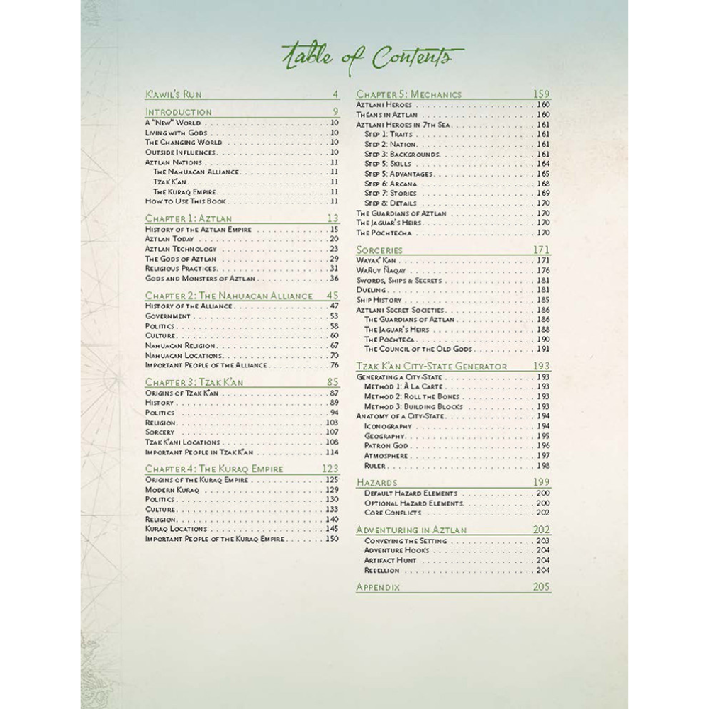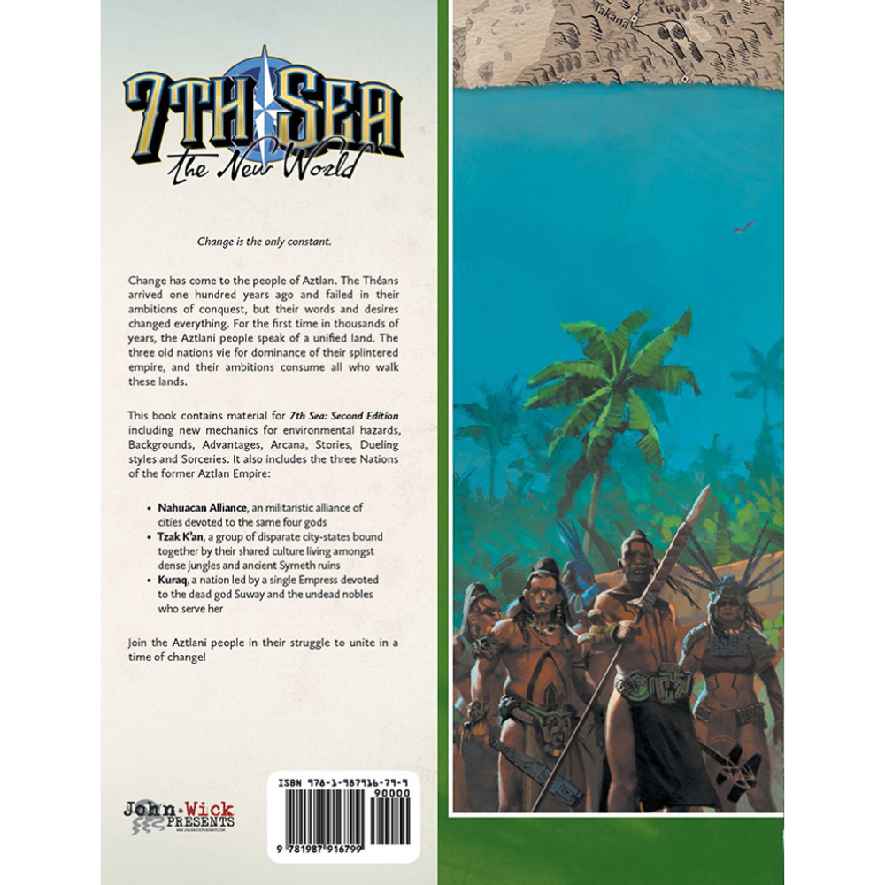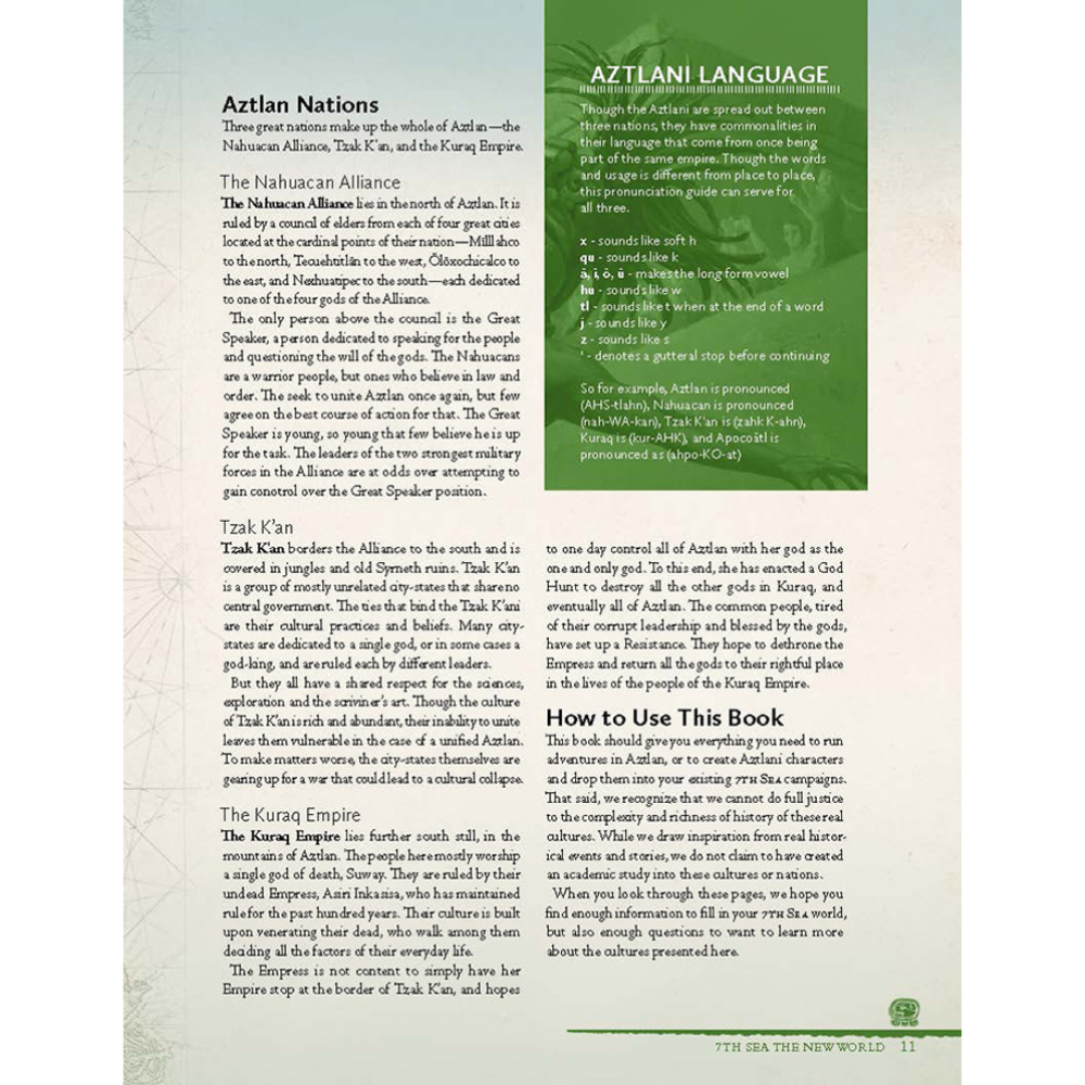 This book contains material for 7th Sea: Second Edition including new mechanics for environmental hazards, Backgrounds, Advantages, Arcana, Stories, Dueling styles and Sorceries. It also includes the three Nations of the former Aztlan Empire: