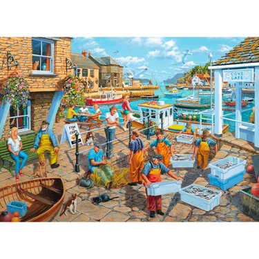 Our fishermen lead a busy, demanding and often dangerous life. This special commission by Cornish artist Steve Cummins captures some of the quieter moments of a fisherman’s day, as they unload and deliver their catches, repair nets and catch up with friends. Fishing ports always have a strong sense of community, and this is reflected in this colourful, busy and nostalgic scene. Behind the fishing activity we get a fantastic view of the small harbour, its busy fishing fleet, picturesque waterside pubs, restaurants and the open sea beyond.