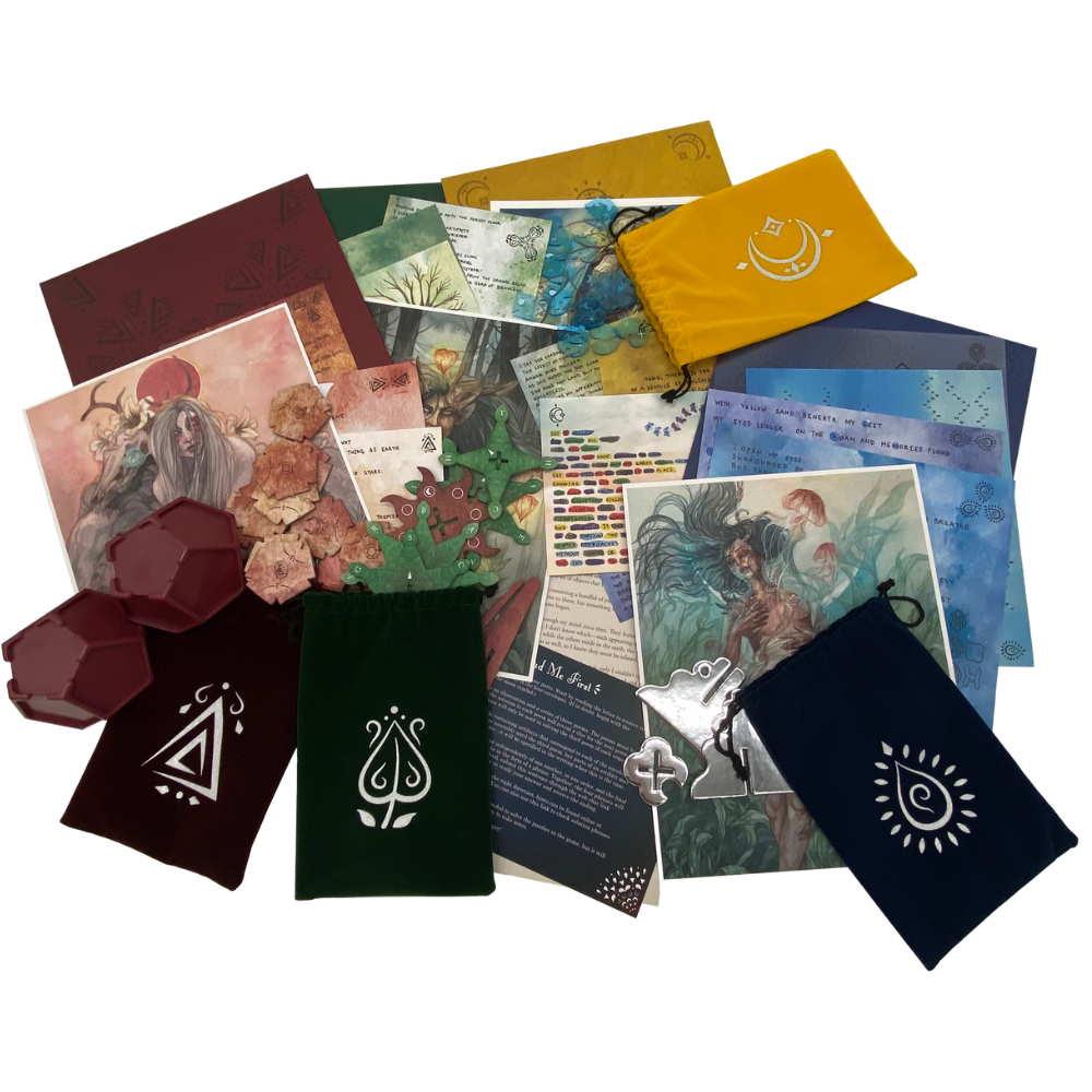 Adrift is played through four parts which can be completed in any order, each representing a different elemental spirit (Sky, Earth, Water, and Forest.) Each section of the game contains three sequential puzzles told through poems, an illustrated poster, and a physical item which needs to be assembled in order to derive a solution phrase.
