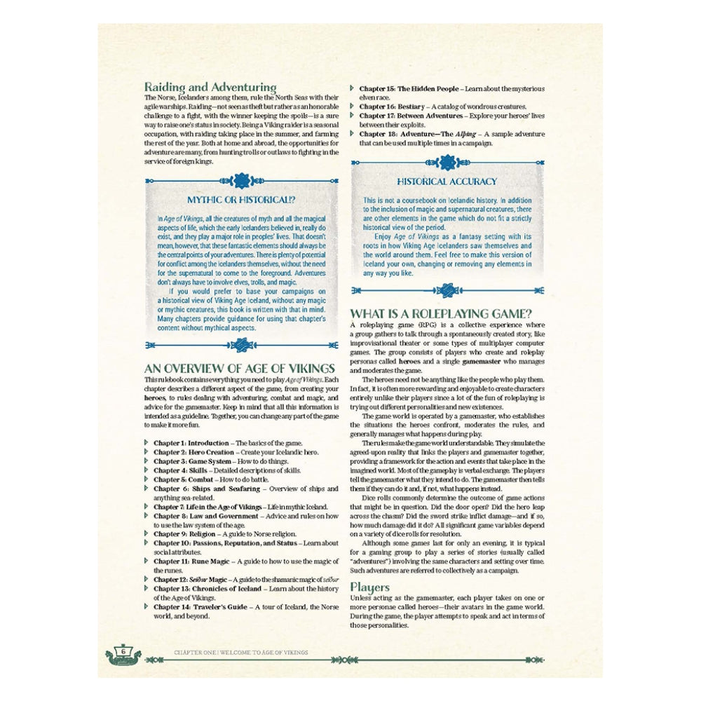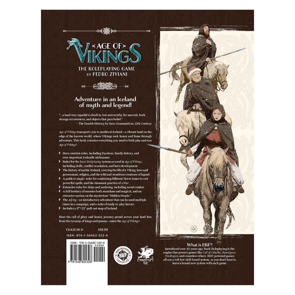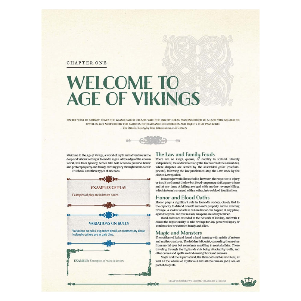 Adventure in an Iceland of myth and legend! Age of Vikings transports you to medieval Iceland—a vibrant land on the edge of the known world, where Vikings seek honour and fame through adventure. This book contains everything you need to both play and run Age of Vikings!