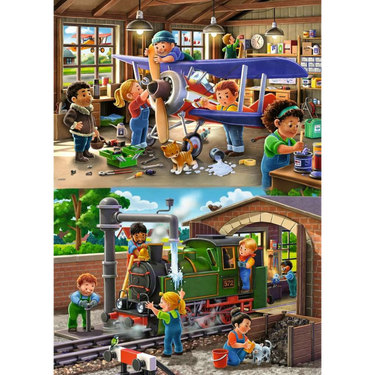 The 2 x 24 Piece Puzzle, Airplanes and Train Repairs is an exciting and educational puzzle set designed for young enthusiasts of vehicles and machines. This set includes two separate puzzles, each with 24 pieces, depicting dynamic scenes of airplanes and train repairs. Can you spot the mischievous little cat?