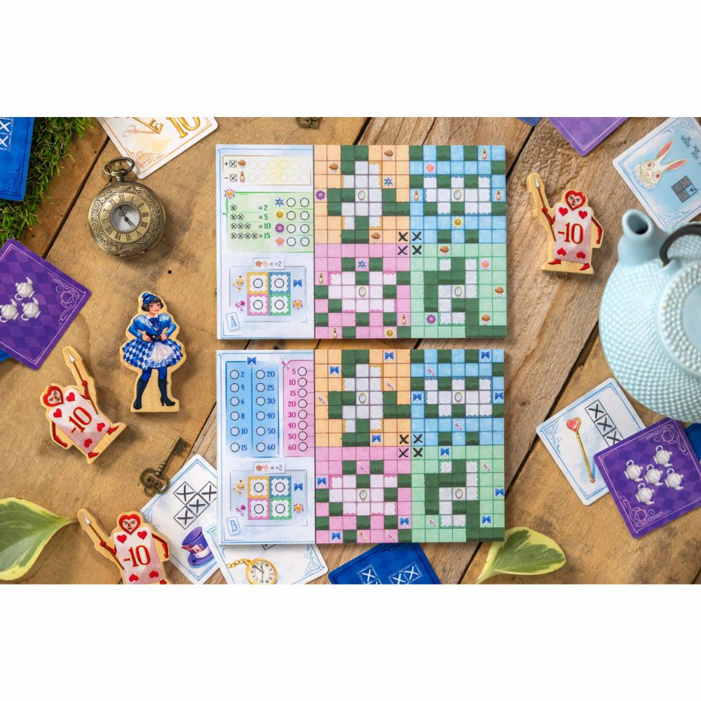 In this competitive flip-and-write game, play solo or in teams as you draw inspiration from Alice to explore a mirrored labyrinth! Trace shapes, activate bonuses, and flip your sheet to maximise your score.