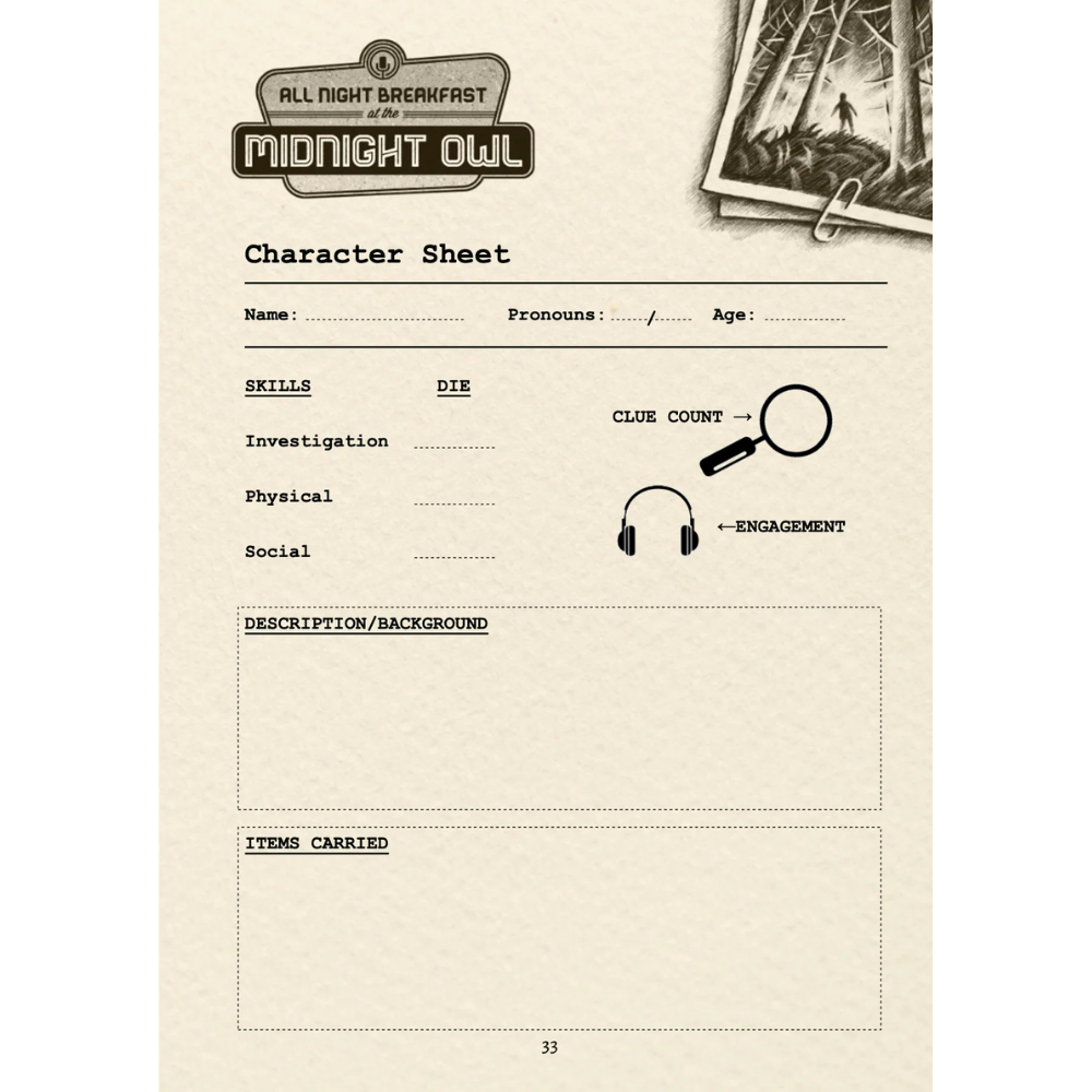 Purchases include digital download of All Night Breakfast at the Midnight Owl - Character Sheet.