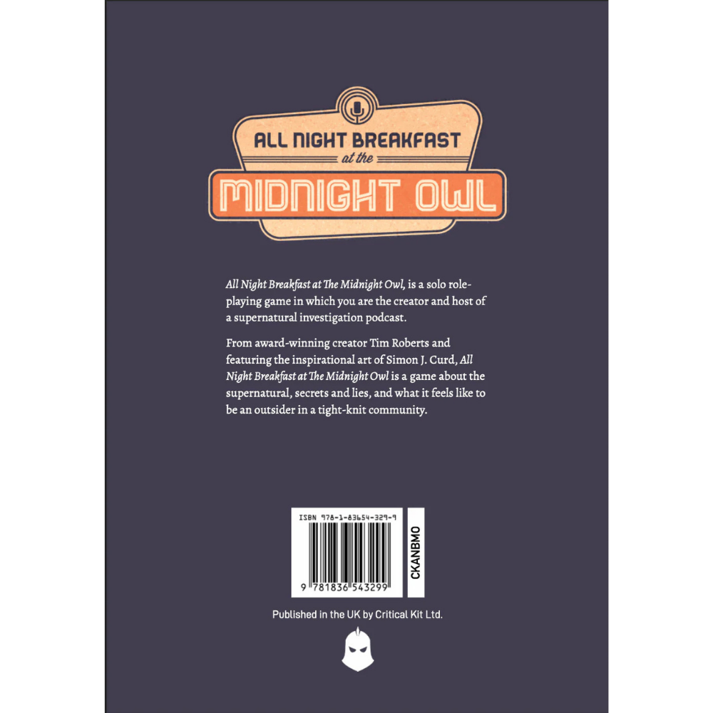 All Night Breakfast at The Midnight Owl, is a solo roleplaying game in which you are the creator and host of a supernatural investigation podcast. From award-winning creator Tim Roberts and featuring the inspirational art of Simon J. Curd, All Night Breakfast at The Midnight Owl is a game about the supernatural, secrets and lies, and what it feels like to be an outsider in a tight-knit community.