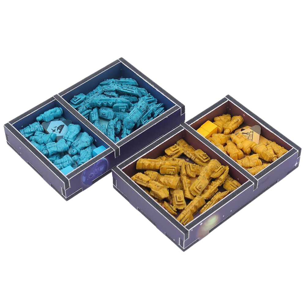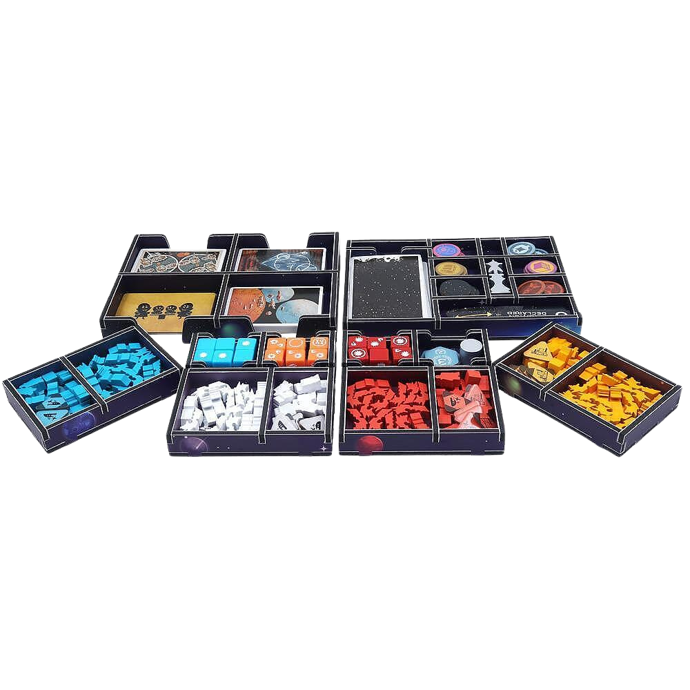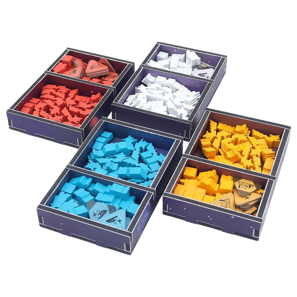 The design provides both efficient storage and improved game play. Many of the trays can be utilised during the game, and they greatly aid set-up and clear-away times. The rules and boards act as a lid on top of the trays.