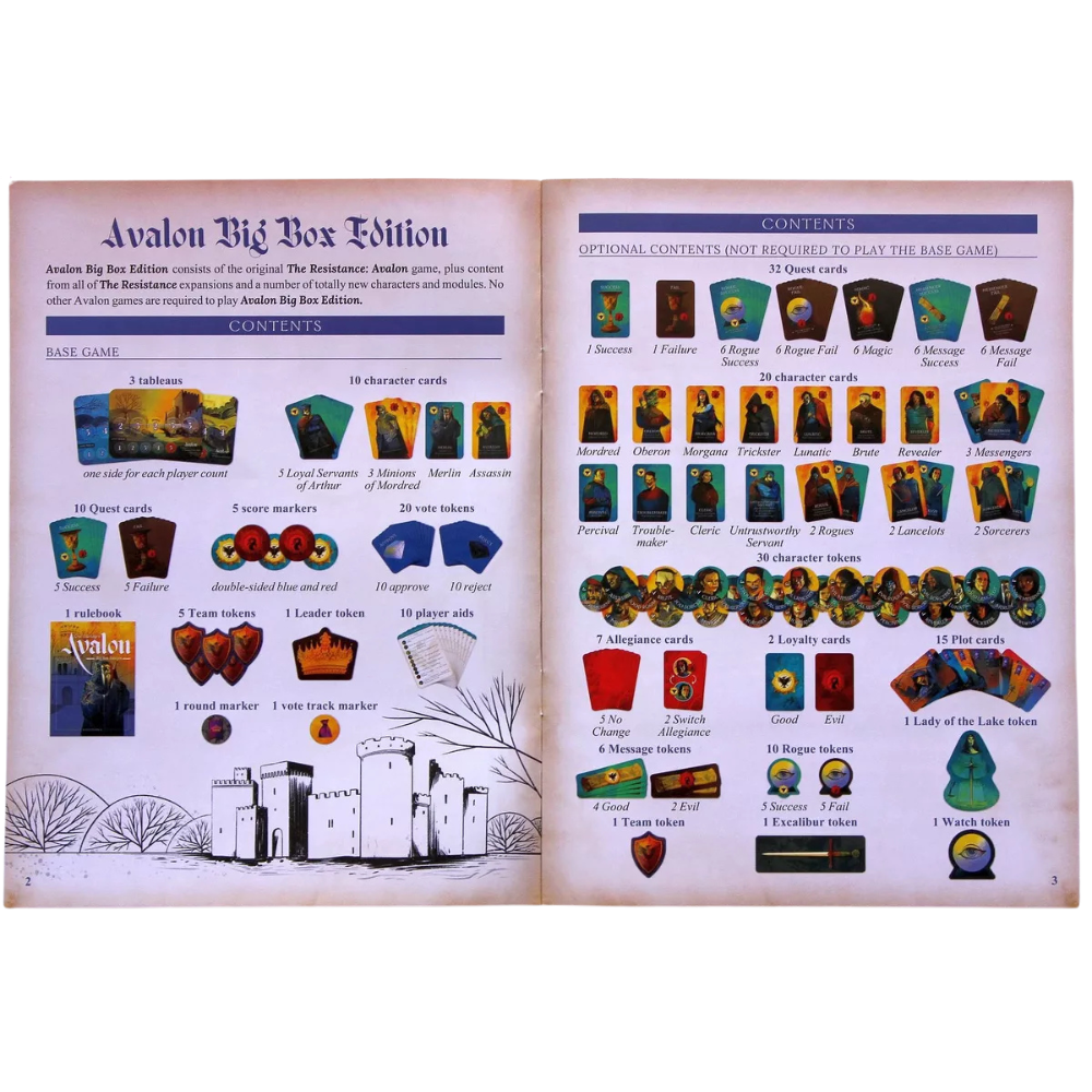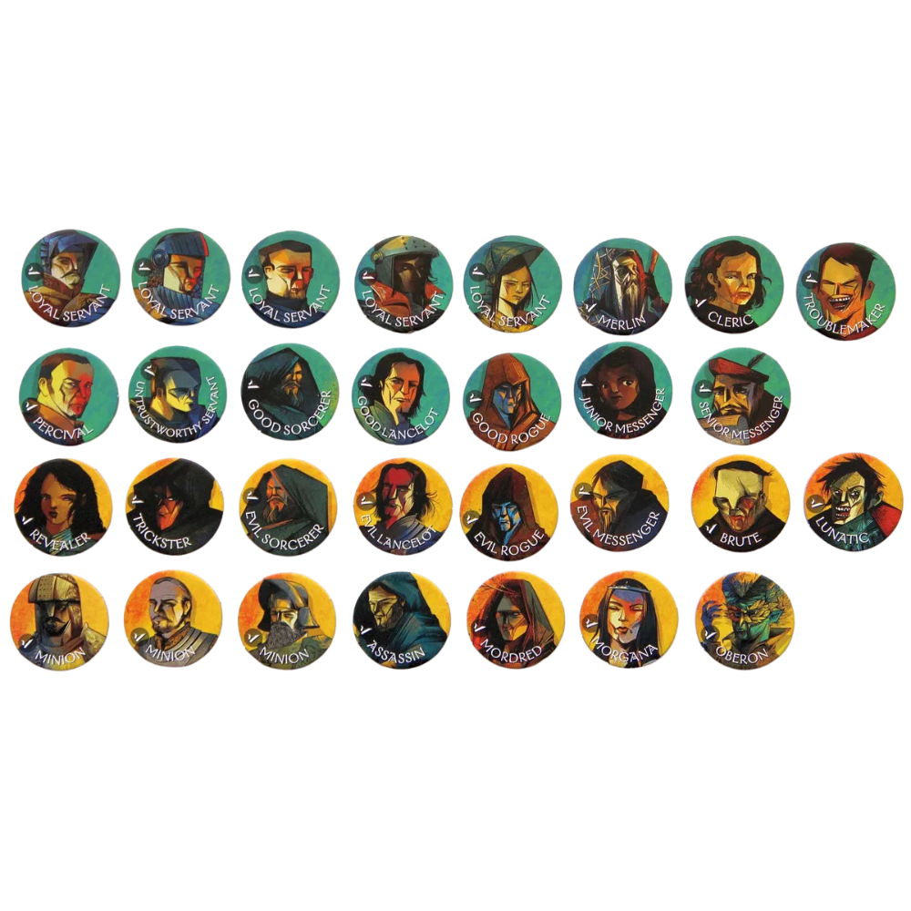 Included are 23 distinct characters and numerous optional modules including Lancelot, Excalibur, Plot Cards, Sorcerers, and Rogues that were released as expansions for Avalon and The Resistance. Also included are new roles and modules such as the Messengers, Lunatic, Brute, Revealer, Cleric, Trickster, and Deceiver.