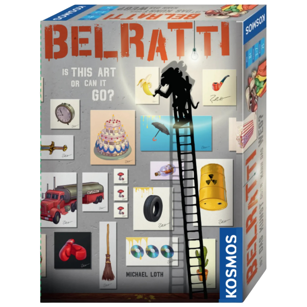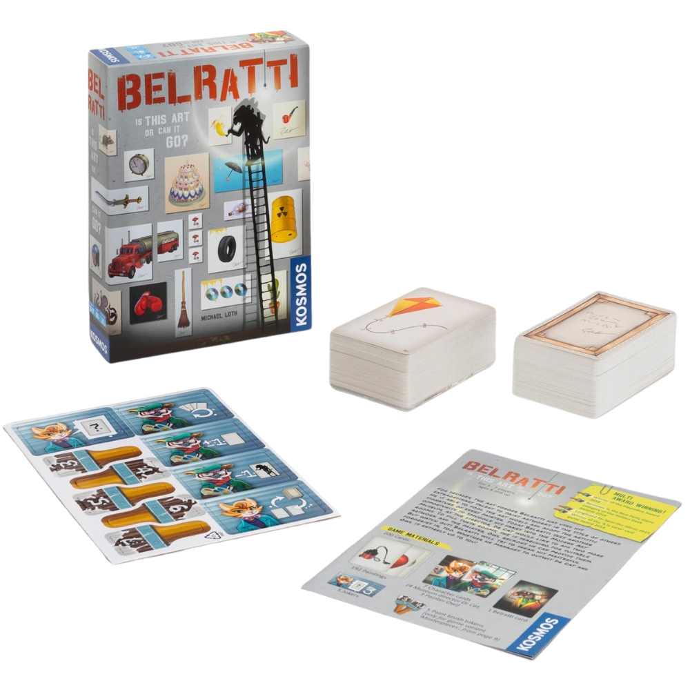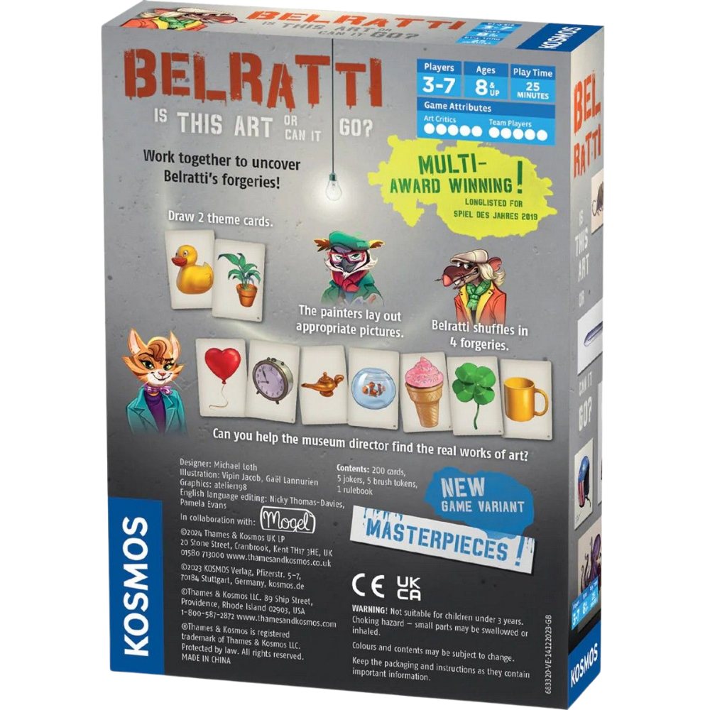 In Belratti, players are split into two roles — buyers and painters — and are playing against the game. The game presents two cards as topics for which the buyers need to buy paintings. They ask for a certain number of cards, and the painters have to collectively meet this target number.