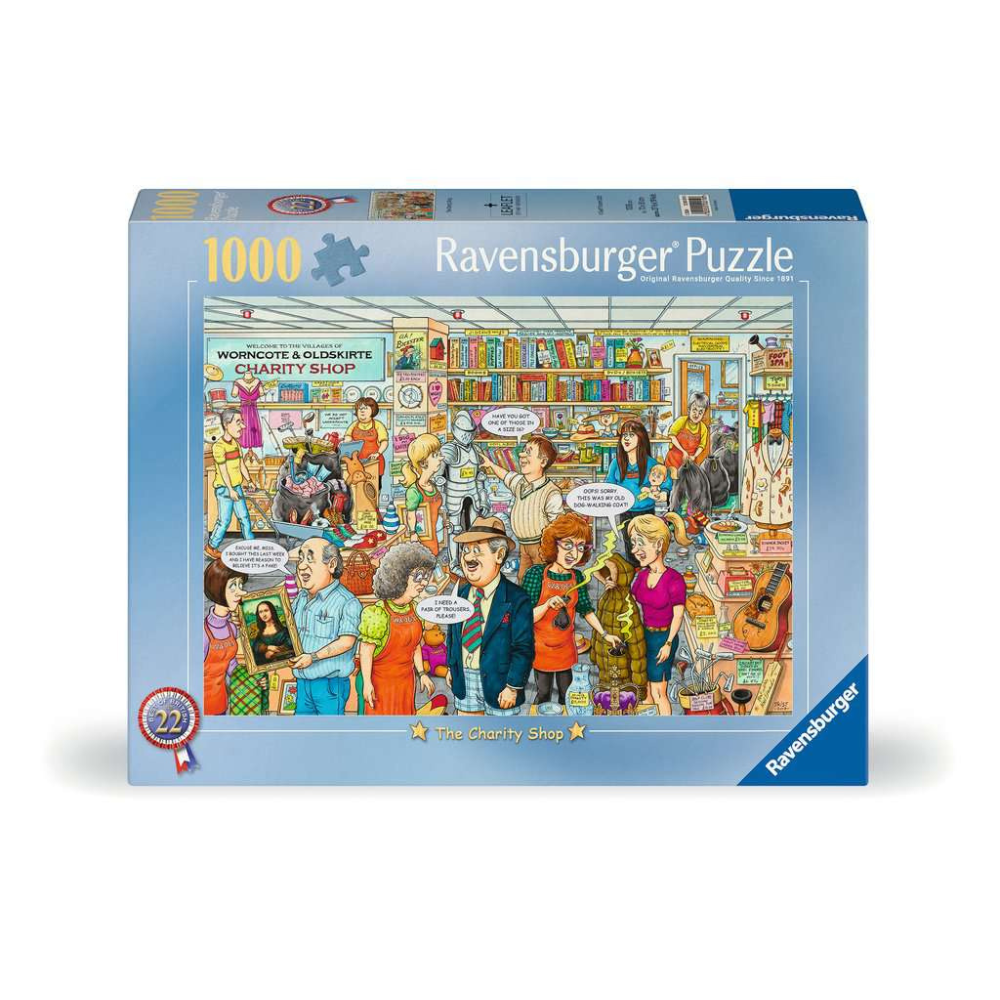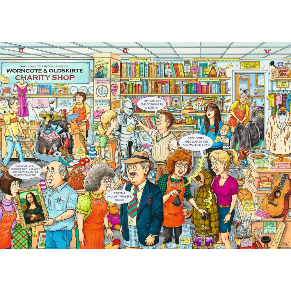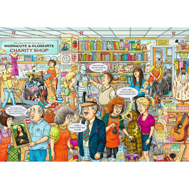 Many of us enjoy a visit to a charity shop, hopeful of finding a valuable treasure, interesting pastime or just the right piece of clothing. You never quite know what you’re going to discover … and you’re going to find some surprises on this puzzle too! Keep a look out for a rare vase, interesting shoes, a hot meal, some battered golf clubs and a coat that you really should avoid … Dip into the puzzle box and discover the delights of the Worncote and Oldskirte Charity Shop! This scene was created by popular West Midlands artist Geoff Tristram, and was inspired by his conversations with charity shop staff
