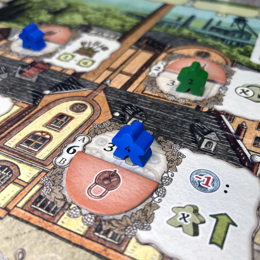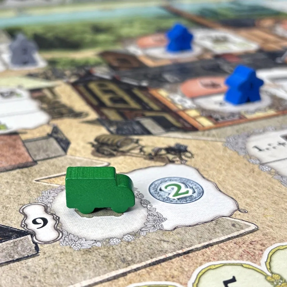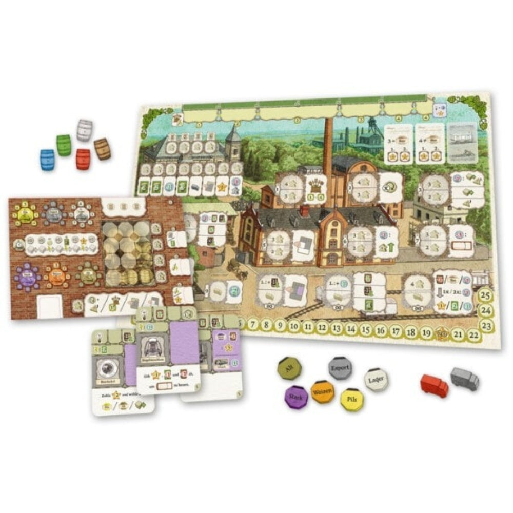 In the game Beer Pioneers, set at the beginning of industrialization around 1850, 2 to 4 players develop their own small home brewery into a large-scale brewery as brewmasters. In each turn, they take an action by deploying one of their workers or their truck to brew an increasing variety of beers, improving the brewing process with new advancements like refrigeration machines or beer filters, or increasing the efficiency of their workers, to name but a few. Action cards also play an important role, and with beer deliveries and other actions, they can earn victory points. Actions take place on the game board and their own player tableau, the player order is important and influenced by the players, bonus workers enable additional actions but must first be earned by placing the right worker on the right action space.