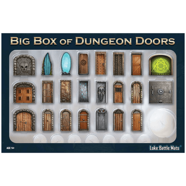 A box of 40 detailed Dungeon Door standees. Presented on clear plastic stands, these beautifully illustrated doors are the perfect a-door-nment to any RPG map or suitable board game.