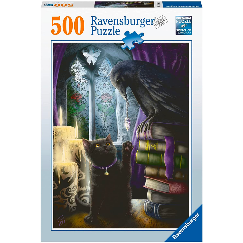 The wizard has left his study, leaving his 2 companions alone. Who is going to be the boss? The Raven, perched atop the wizard's books of spells, keeps his beady eye on the fluffy black kitten. The kitten is either being bold or is he raising a paw in defeat? Moonlight streams through a stained glass window, its glass panels forms in designs of cobwebs and rich red roses.