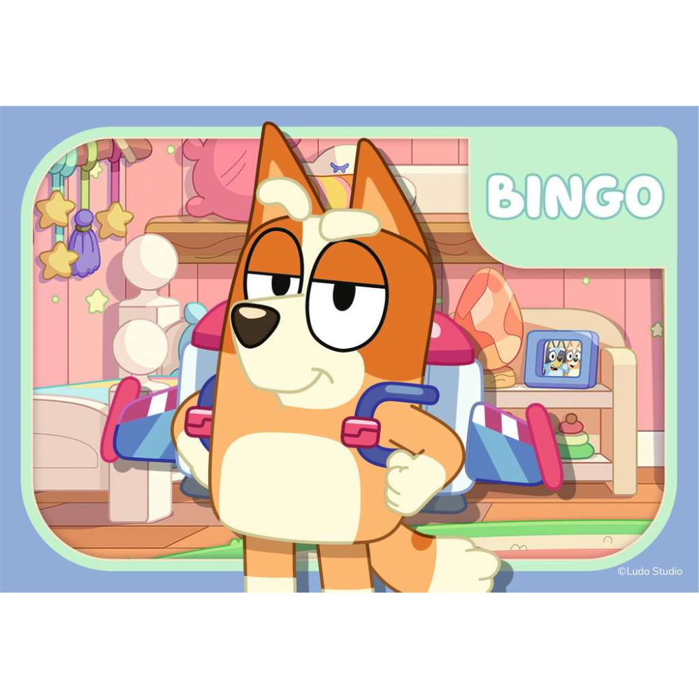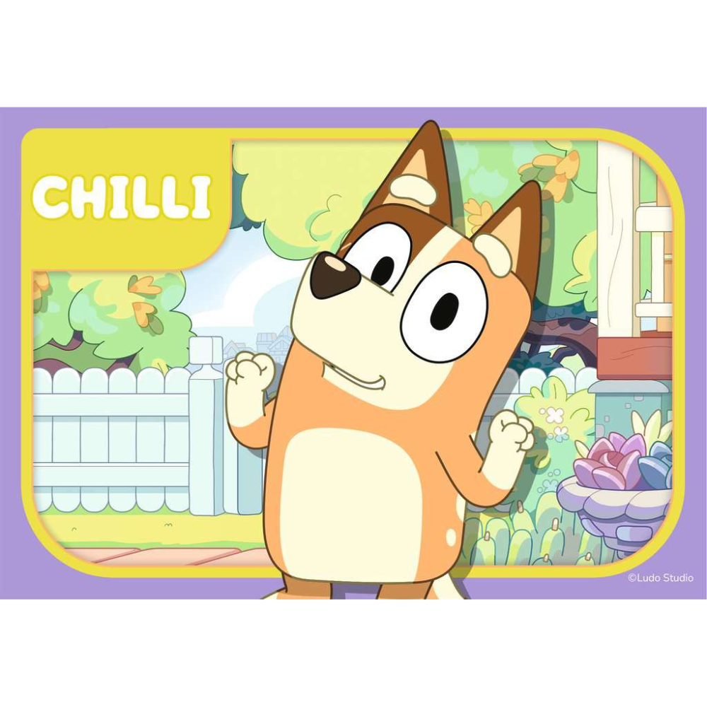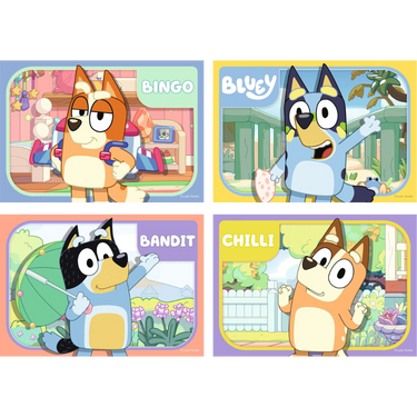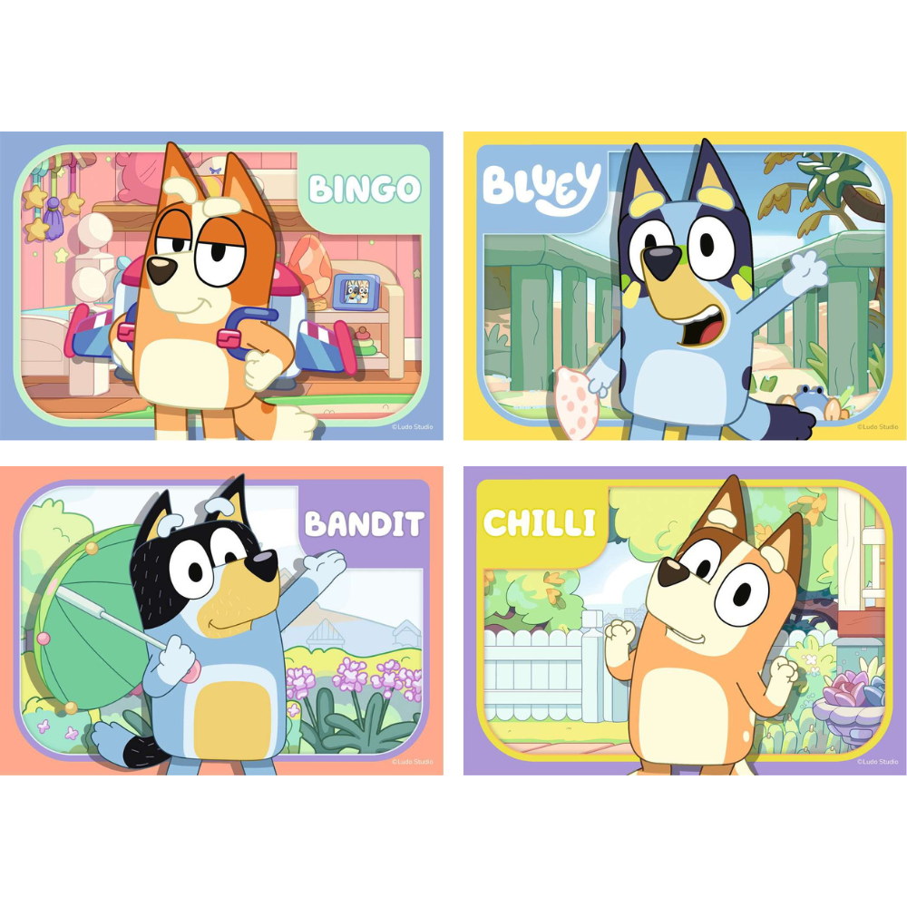 Join Bluey, Bandit, Bingo and Chilli as you piece together these four, bright and colourful jigsaw puzzles. Starting with a 2 piece puzzle and finishing with a 5 piece puzzle, this puzzle pack is a great starting point for any child starting out with their puzzling experience with a progressive piece count!