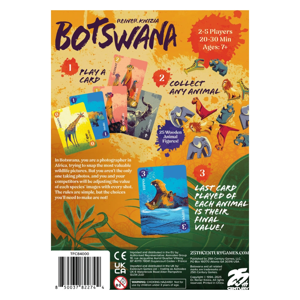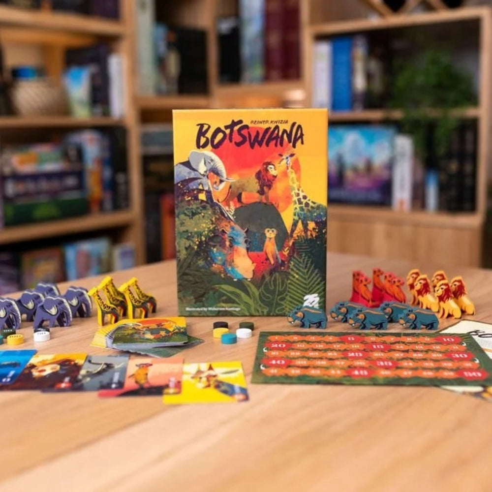In Botswana, you are a photographer in Africa, trying to snap the most valuable wildlife pictures. But you aren’t the only one taking photos, and you and your competitors will be adjusting the value of each species’ images with every shot. The last card played for each animal determines the final value. The rules are simple, but the choices you’ll need to make are not!