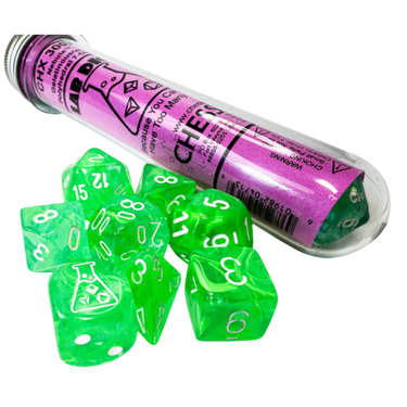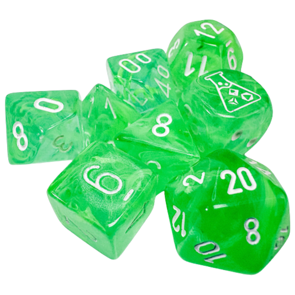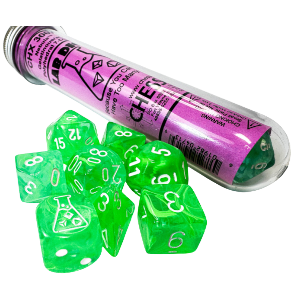 This set contains 8 Nebula Gelatinous dice with white numbers with the following shapes: