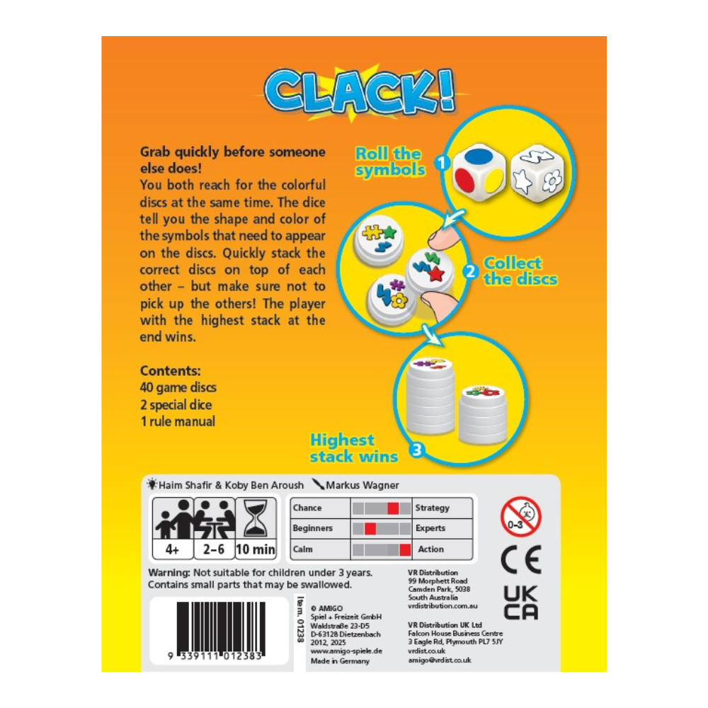 CLACK! is both the name of the game and the sound that the magnetic discs in the game will make when you slap one against another – and slap them together you will as you're trying to claim the right discs as quickly as possible.