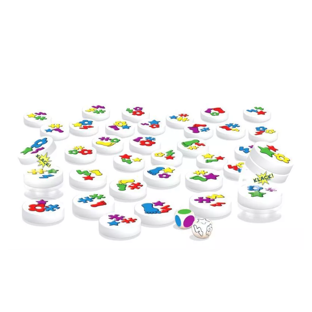 To set up the game, lay out all 36 discs face up so that everyone can see the colored symbols on them. One player rolls the two dice – one showing colors, the other symbols – then everyone simultaneously tries to grab any discs showing the colored symbol determined by the die roll. If a die shows a white face instead of a color or symbol, then that characteristic is ignored for the round. For example, if the roll is white (i.e., blank) and red, then players can grab any disc with a red symbol. If both dice show white, then it's a free-for-all, with players grabbing as many discs as possible!